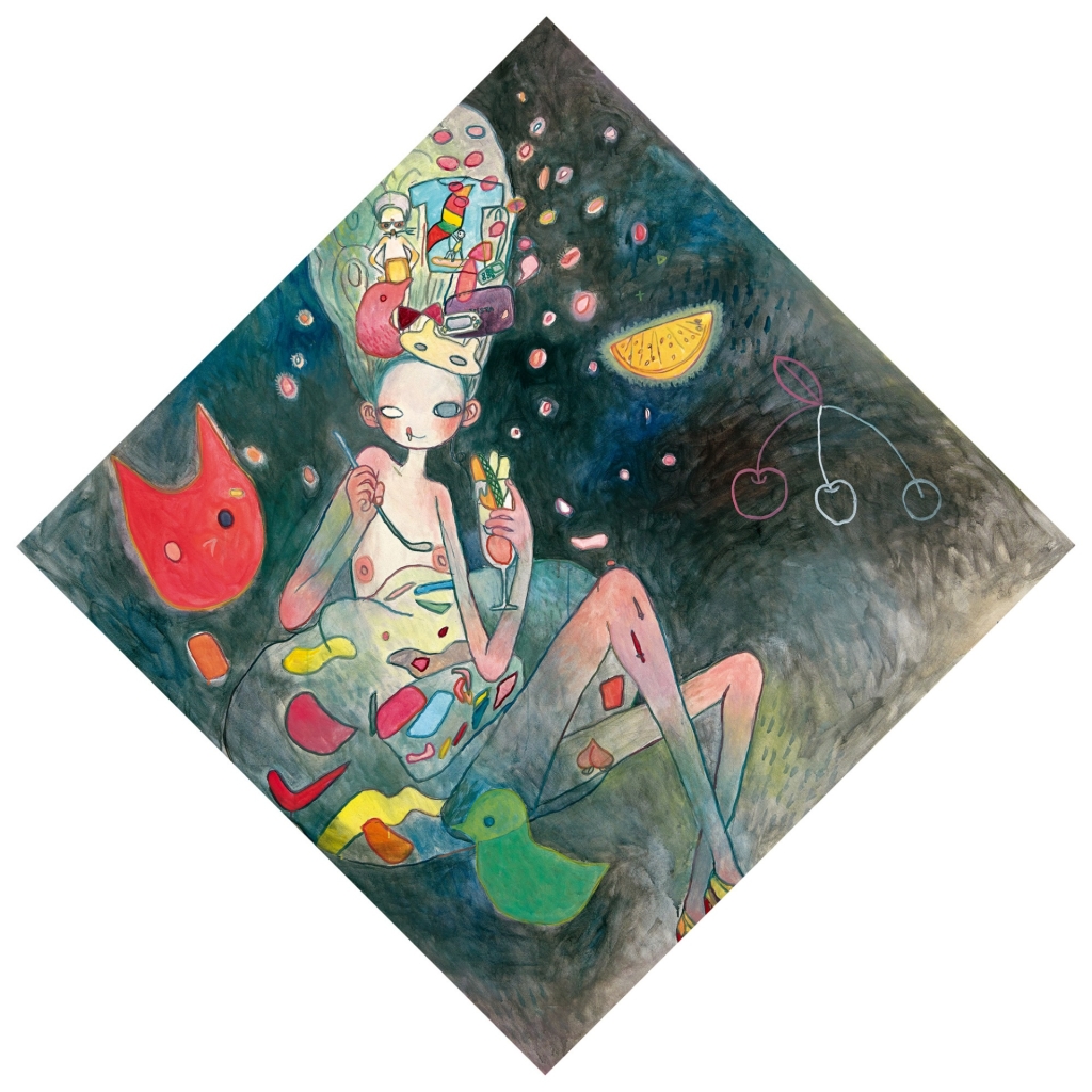 在此作暗夜的背景中,一妙齡少女斜倚於漂浮的雲彩之上,她手持裝滿水果的雞尾酒,周圍被小動物環伺,而落英繽紛的花瓣在周圍飛舞,展現出悠遊天地的繽紛世界。少女造型誇張的長髮,令人聯想到法國路易十六時期的瑪麗皇后以如棉花糖般的髮型裝扮,鼓勵舊時女性以盛裝取悅自我。在無垠天際上坐著雲彩翱翔的視象,令畫面帶有夏卡爾(Marc Chagall)的典型意趣,令作品散發出詩樣爛漫迷濛的天真。而藝術家特意在此以菱形的角度構圖,別出心裁地建構起一個獨立於現實之外、不斷延展的平行世界。