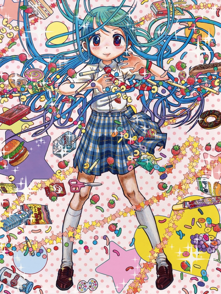 《行使我的超能力》為Mr. 2012年於紐約「蛻變:給我你的翅膀」大展中重要代表作。畫中清新的高校生周身為星星光束環繞,此與日本80年代風靡的「魔法小天使」動畫中主角變身時出現的光彩不謀而合,藝術家以平凡少女變身超能力神女的母題,反映日本御宅族文化對於制服美少女、「萌」的迷戀、對於「蛻變」的嚮往。畫中可見藝術家精心描繪的各色甜品,均如宇宙星系般脫離地心引力地浮在半空,將觀者拉入「超現實」幻境,若言說了彷彿吃完它們便又有動力面對生活中一切困難,這般有趣而寫實的心理。當中,一陣微風裹挾著漩渦狀的美味,不經意撩起女孩的短裙,帶有幾分春光乍洩、色色空空的俏皮。畫中少女雖萌態可掬,卻以正在實施的「魔法」,展現絕對的自主和掌控權,此超然的「女力」以積極而正向的面貌,反射出時下女性自主、獨立,超脫傳統男性視角桎梏的當代社會面貌,別具深意。