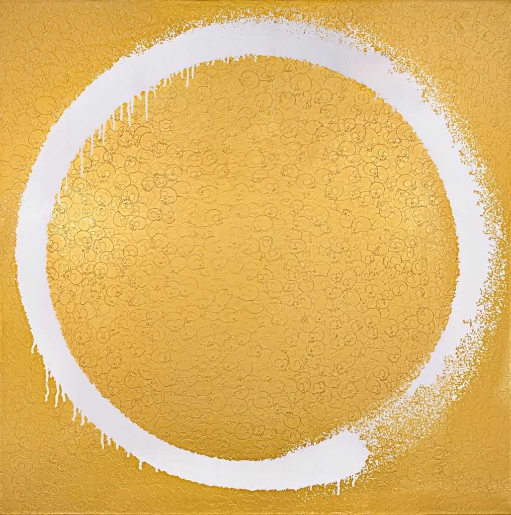 2000年村上隆提出「超扁平」(Superflat)理論,使此扁平、卡漫、萌的風格正式被納入國際視野,並成為當代藝術史脈絡中不可撼動的有力分支,曾被盛讚為「平成時代最偉大藝術家」。在2011年日本311大地震、父親去世等創傷影響下,使村上隆投入對於禪宗、佛學的探索,其創作產生關鍵性的巨變,開始以佛教禪宗中的高僧、代表悟道的「圓相」等元素入畫。完成於2016年的《禪圓相:無限》即為該時期的經典。在此作耀眼的金箔背景中,可見無數村上隆創作中的重要元素——卡通「骷髏」,它們聚集了各式喜怒哀樂的情緒。而金燦的背景令人聯想到傳統日式金碧重彩的屏風,為畫作增加了另一層宏大的氛圍。藝術家以白色噴漆在金色背景之上噴出一個圓形,此象徵真理、達摩祖師的智慧之眼,並特意在圓的收尾留下半虛半實的缺口,預示接受生命中的不完美才能使之完整。作品展現村上隆在人生經歷事業成功、低谷,親身經歷生離死別後,成熟的心境與其所體悟的終極感悟:「萬境歸空,流轉不息」。