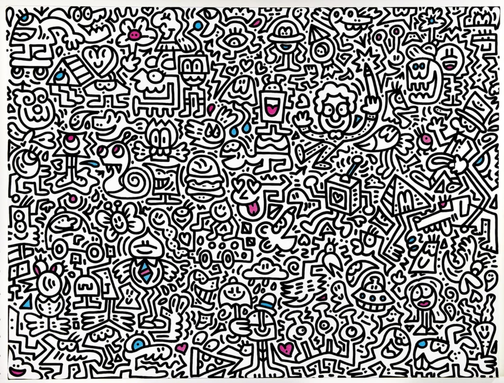 在巨幅(150×200公分)的《無題-1》中,Mr Doodle以最極簡的黑白色彩表達他最複雜與豐富的視界。全幅以藝術家魔幻般的意識流、天馬行空的驚人創作力一舉完成。在畫面中右處,罕見地出現Mr Doodle的自畫像,臉上充滿喜感的誇張神情。而其手中高舉的畫筆如魔法棒般,瞬間創造出整個塗鴉王國!在畫境的世界中,外星人與開車、打傘的地球人、有著翅膀的精靈、騎著烏龜的機器人、長出長腳奔跑著散播愛的能量的電視機、單眼怪獸等等各色擬人化的動物與活動起來的符碼在此交融,繁忙又充滿活力正如我們所處的世界。在此古今時空與地域交錯,時而我們像是來到倫敦繁忙的大馬路,轉眼又見神秘的埃及金字塔,或一躍前往外太空,隨著Doodle筆下的線條,我們的想像力也若打破二次元的邊界,衝向無窮,一頭栽進感受那紛繁躍動的生命活力。