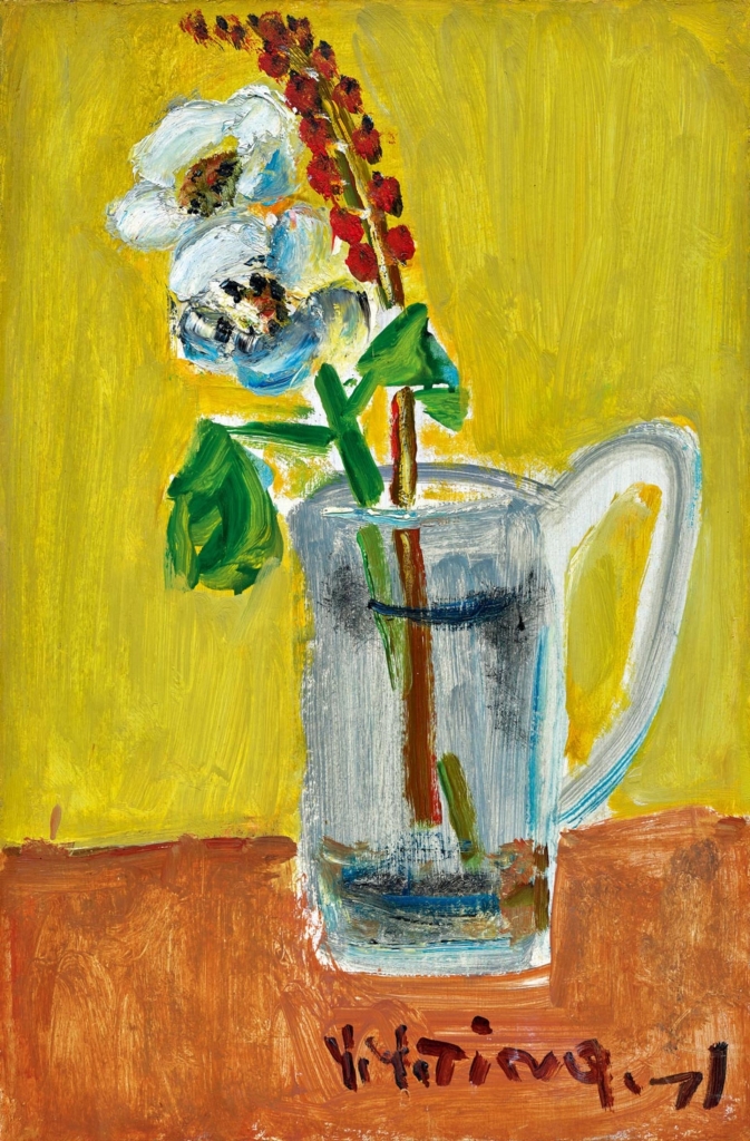 完成於1971年的《芬芳》,為丁衍庸畢生存世僅只200件的珍稀油畫作品中,僅22件的花卉主題作品之一,當中另5件已由香港中文大學典藏,彰顯此作之珍罕。在作品以銘黃、粉橘打造的純色天地中,奪目鮮妍的一串紅與嫻靜舒雅的白銀蓮比肩而立,雙姝並開,如著紅裙熱情奔放的女子與冰霜美人比試著各自的萬種風情,藉由筆之律動、色之碰撞,演繹著欣欣向榮的豐盈生命力。而丁公並獨到地以淺灰藍彩打造一尊晶瑩剔透的玻璃花瓶,令光線在其中躍然映照,而明亮的藍彩和刻意的留白處理,更在其中創造出「氣」的流動,使得畫作整體呈現出一種滿而不塞、空則生色的空間張力,極為動人。畫作中,銀蓮象徵的「期待」、一串紅寓意「吉祥」的花語,更展現此時期丁公洋溢的藝術熱情、精神上的愉悅富足,傳遞其心境的豁達和對生活的美好期盼。正如作品之名《芬芳》,其格調、其境界、其藝術,必將流芳百代、香滿人間!