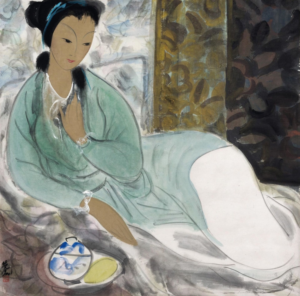 林風眠於1951年定居上海後,將觀看京戲作為日常消遣,並由此開啓他標誌性的「古裝仕女」系列。其筆下的女子,將魏晉時期的壁畫、宋瓷中的傳統元素與巴黎畫派現代造型語言間的完美融合,為中國古典繪畫帶來突破及革新,《綠衣仕女》便是箇中代表。他在此將宋瓷冰清玉潔的質感及精神注入人物的神髓,觀者從畫中斜倚的主角可感受徬如夢般難以觸及的高潔和美麗,一襲烏髮、鵝蛋臉、柳葉眉及點絳的紅唇點明其來自東方的身分。女子「孤芳不自賞」的情態,恰如林風眠所言:「中國藝術之所長,適在抒情」,是藝術家將東方女性美好特出的氣質和當代美學交融貫通的非凡之作!作品並來源有序,為著名書法家、中國駐印度外交官、基督福音《燈塔月刊》的創辦人劉翼淩之女——法蘭西斯.劉.德之舊藏。劉翼淩與林風眠為梅州中學同窗,直至1950年代林風眠旅居重慶時,彼此仍有往還,交情深厚,彰顯此作之珍。