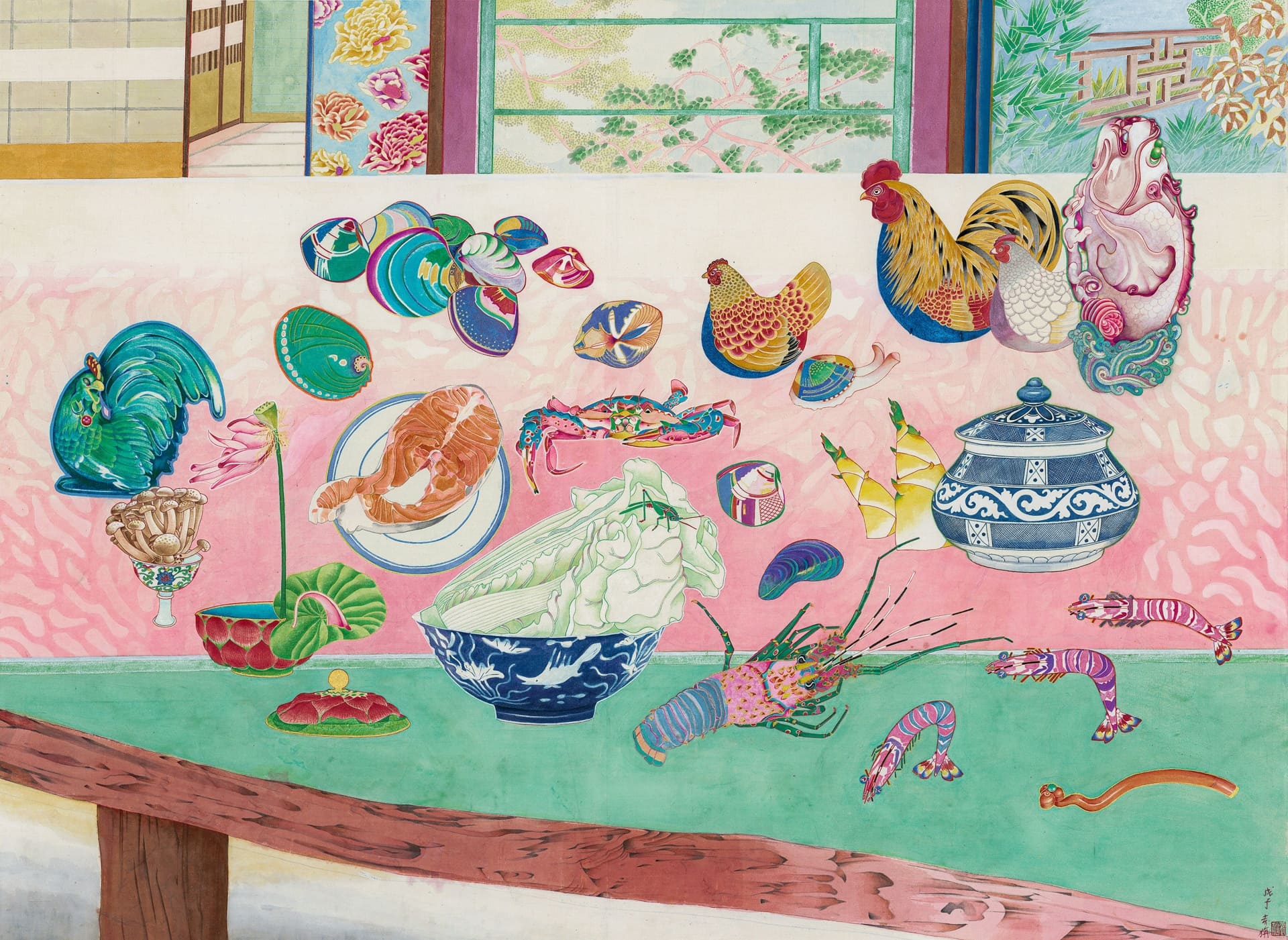 而本場的黑馬之作,可謂袁旃的兩件水墨設色絹本作品,反映其博古通今的藝術創作手法均獲買家熱切追捧。先行上拍的《餐桌》估價為50萬至120萬港元,自45萬港元起拍後拉抬至220萬港元才落槌,最終以264萬港元成交,搶進全場第六高價,並締造藝術家拍賣紀錄;而接續上拍的《雙雙對對之一》,亦拍出突破高預估價的108萬港元成交價。