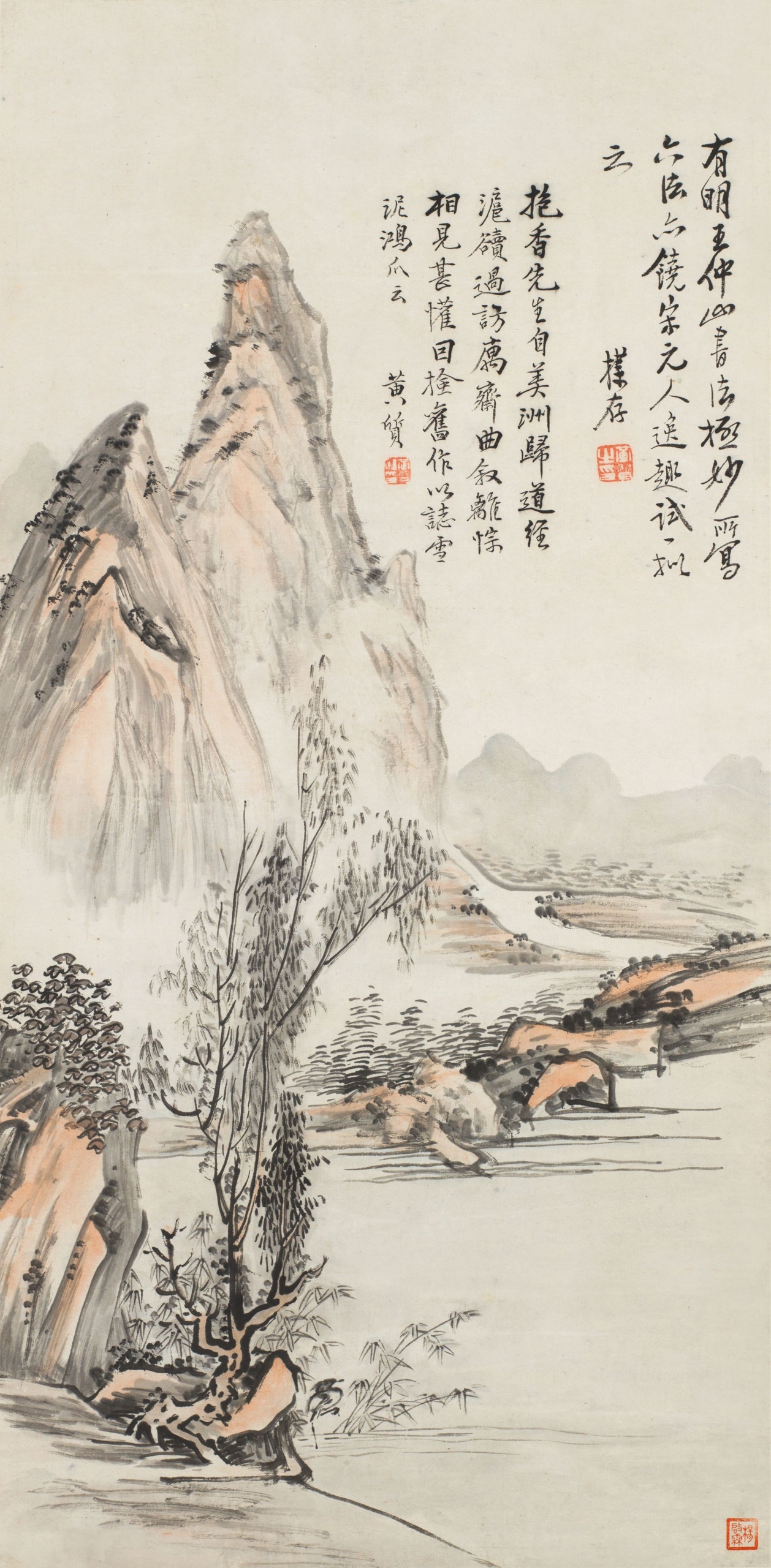 溥心畬及黃君璧書畫珍跡,則有溥心畬結合南北宗山水畫法的《秋江亭臨》、用筆靈動絕妙傳神的朱竹與墨筆蜘蛛《喜結雙朱》。黃君璧《松林山澗圖》為空靈粗放與融繁細密之感,在山水的氣韻淋漓中增添蒼潤之質;《溪亭清夏》小品一作中,表現出擅於石谿之筆法,是其典型的山水畫風格;《衣瓜索瀑布》則為君翁在參觀舉世聞名的衣瓜索瀑布後,融會水墨的經典水瀑精品之一。中國近代水墨家黃賓虹專研傳統繪畫流派且提倡與寫生並進,《雪峰秀澤》則藉由書畫筆法將師古人與師造化融合,為其早年落款黃質的「白賓虹」時期難得之珍品。