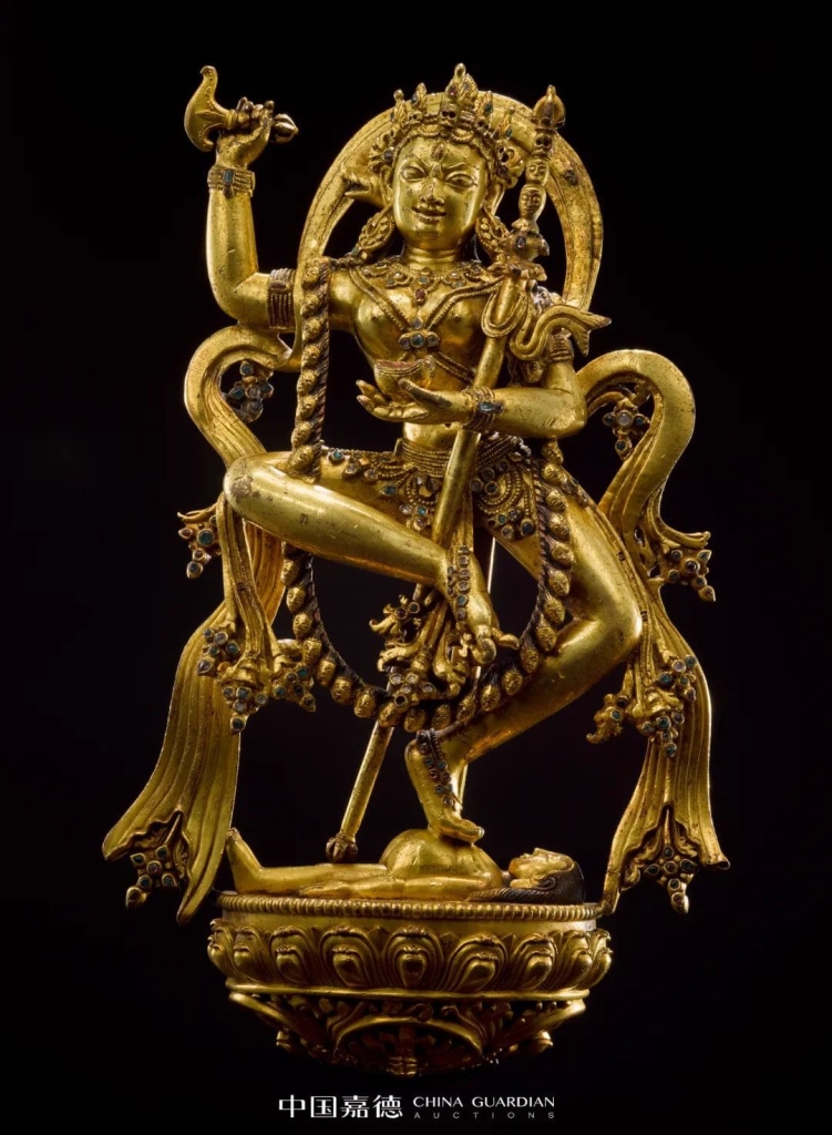 丹薩替造像以丹薩替寺而得名,以風格壯美、裝飾繁縟、工藝精湛、存世量少,備受市場喜愛。此供奉於扎西果芒塔上的雕像,有別於一般佛像供於佛龕內或神壇上,而是供於靈塔的塔身周圍,約五公尺高的吉祥多門塔依照藏傳佛教密續儀軌次第供奉各種鎏金銅像,形成勝樂金剛法境。丹薩替寺造像吸收了尼泊爾造像藝術魅力,又融入當地藏族獨特的審美情趣和宗教信仰,形成了一種獨特的並具有地區性的尼藏融合的藝術風格,代表了西藏佛像藝術的最高成就。此件藏傳佛教重要本尊金剛亥母,金色悅目燦爛,銅質厚重,技藝精湛,流光溢彩。
