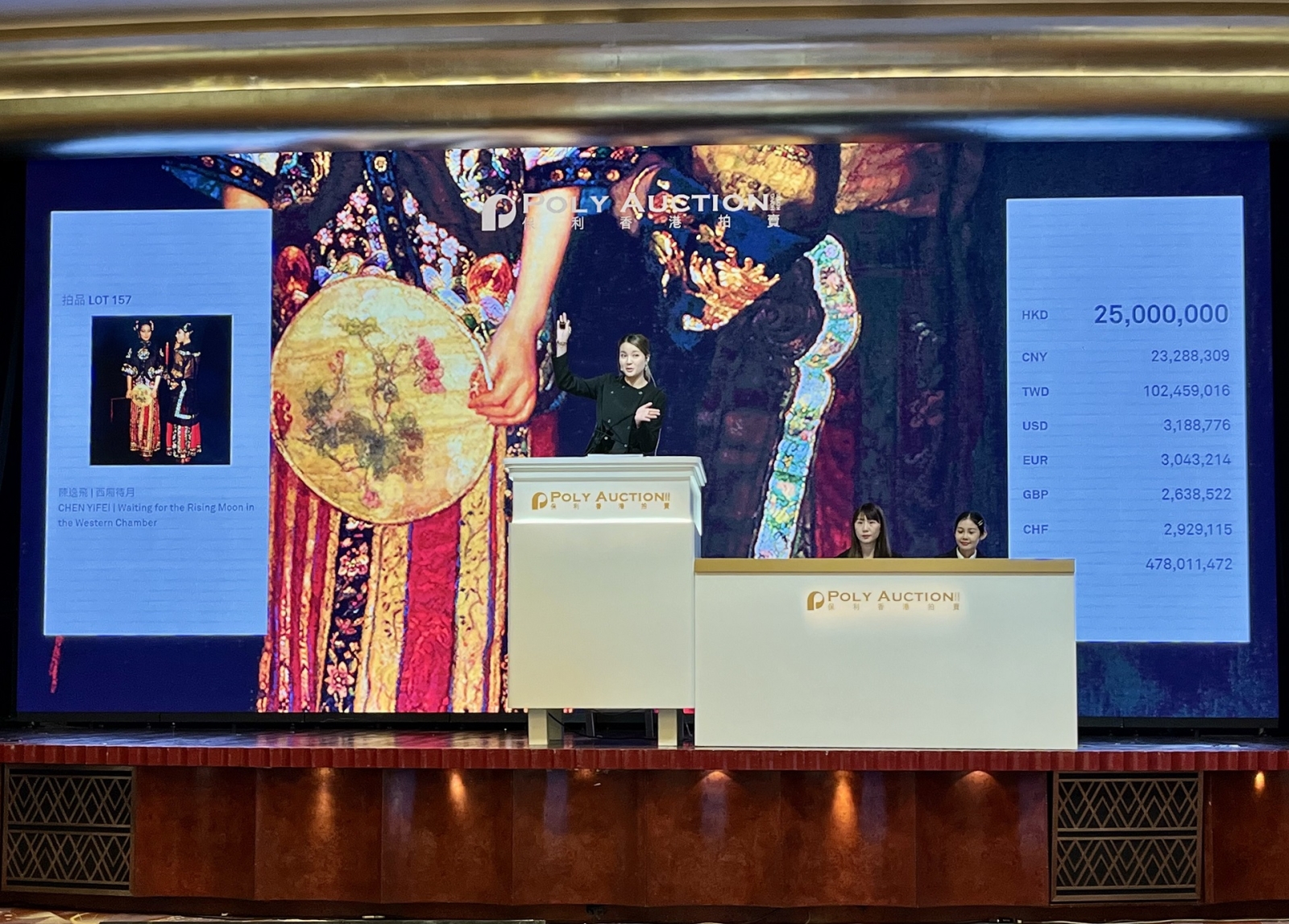 本場以陳逸飛的《西廂待月》領銜,此作為藝術家最膾炙人口的「海上風情」系列,揉合古典文學典故以再現中國仕女的美學圖式。在登場前已收到多筆書面競投而自1800萬港元起拍,儘管現場有電話委託買家加入戰局,終究仍不敵書面委託買家的2,500萬港元出價,最後以3,000萬港元成交價,登上本場冠軍寶座。