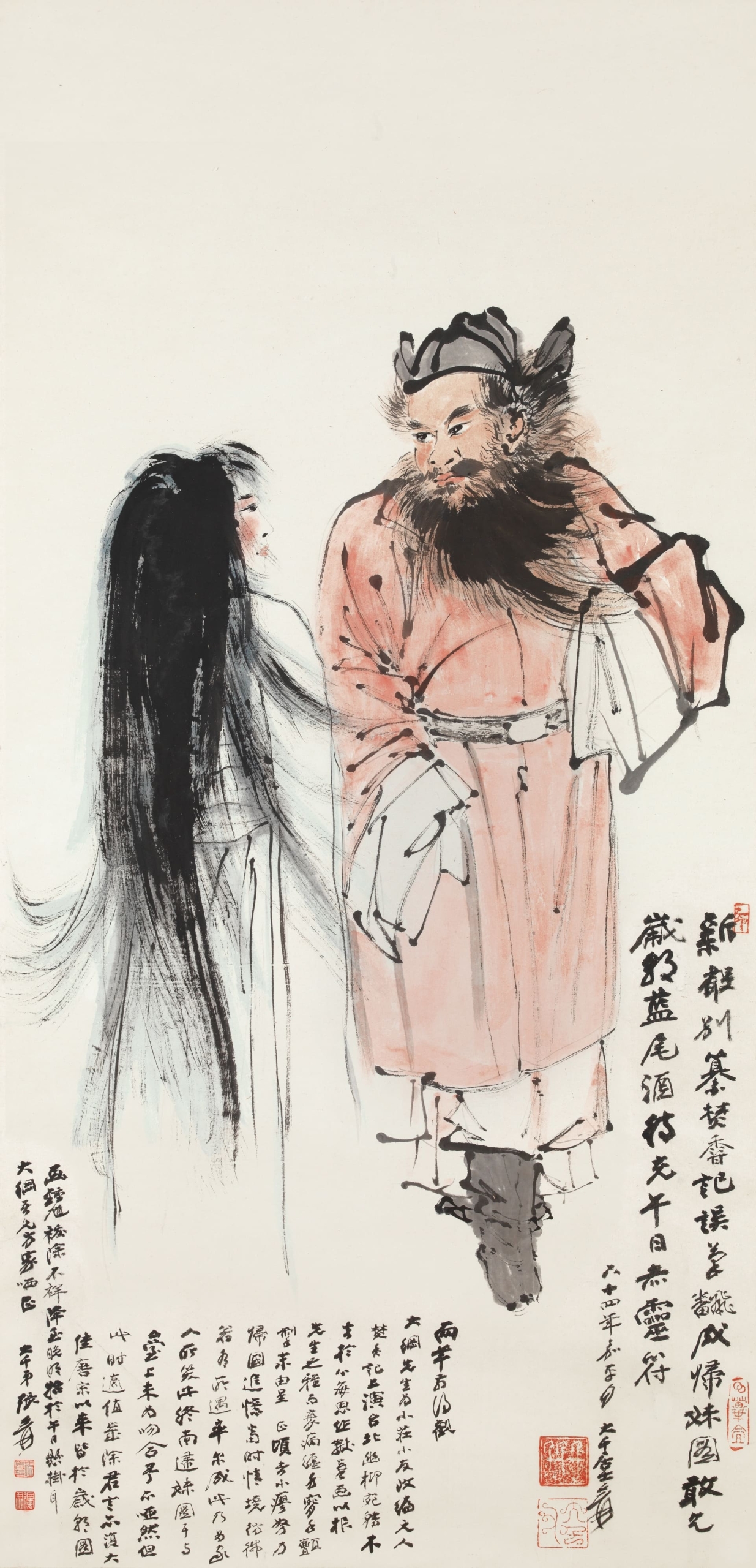 多幀來源有緒之書畫精品備受矚目,尤以張大千《歸妹圖》為領銜焦點。本幅乃近代中國戲曲專家俞大綱先生家族所藏,1974年張大千返美前觀賞俞大綱重新改編的京劇,並由郭小莊擔綱演出,深受此劇感動返美後仍念念不忘,時張大千身體狀況欠佳,手腕掣顫而擱置不成;而後張大千決定返台定居前夕的歲末,趁健康恢復之時追憶當時的演出劇情,因此於1975年歲末完成此作並贈與俞大綱,畫上題款二回以記之,成為藝壇佳話。圖中鍾馗相貌極似張大千的自畫像,長髯飛鬢、眉濃髮密,頭戴進士帽、身著長袍灰靴,右臂端起水袖,儀表堂堂地與身旁的妹妺對視;鍾馗妹造型長髮披散、白裙水袖以拖絲飛白的技法寫成,神情樣貌若有所思,此作故實增益了近代歷史文化發展意義,為世存張大千自畫像中極為可貴且獨一無二的創作。畫成隔年(1976)於國立歷史博物館「張大千先生歸國畫展」中展出,同年著錄於史博館出版之《張大千作品選集》,此後著錄出版不絕。