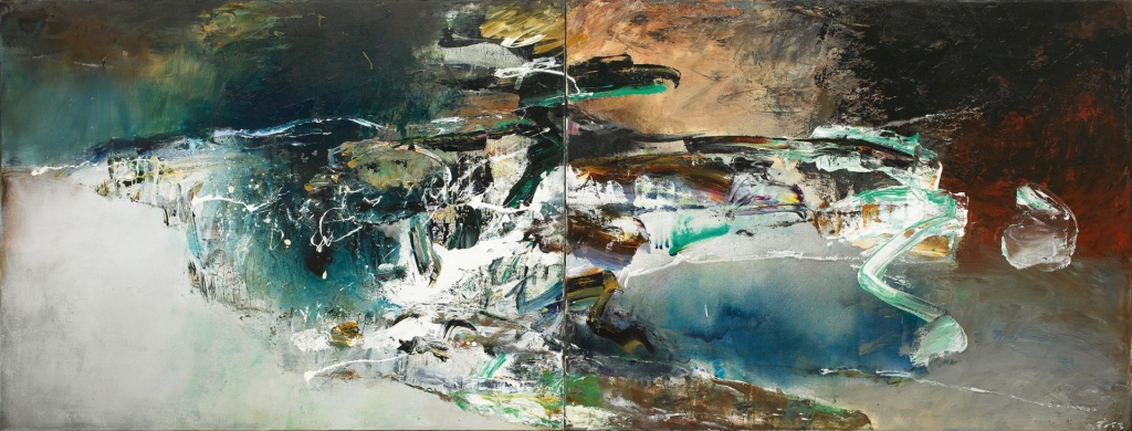 莊喆為五月畫會的核心成員,自1970年代移居美國,當時美國畫壇盛行的抽象表現主義的影響,開始運用稀釋後的油彩、壓克力和水墨進行創作,藉由筆刷的自由揮灑的動勢,表現其對中國山水畫本質的探求。本次上拍的《青河》(雙聯幅)創作於1994年,仿若可見河水流勢經過解構後,更為奔騰的靈動生命力。而五月畫會創立成員的劉國松則以饒富東方哲思的太空主題意象在東方美術佔有一席之地,即將上拍的《月之變位之四十》完成於1974年,以設色鮮明對比生動的幾何造型,並以他獨創抽去紙筋的創作手法由白色紋理表現地球表面的海陸分布,不僅傳遞出中國傳統繪畫何以觀照日月山川的情懷,更以凌空俯瞰萬物的視角感受到蒼茫宇宙的浩瀚無垠。