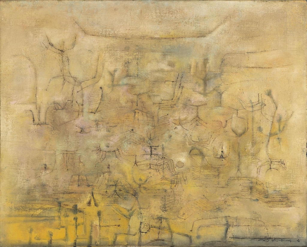 本場由趙無極創作於1953年的《在植物園裡》為焦點之最,此作屬於「克利時期」的創作階段,係以簡化的形象來描繪觀察的對象為當時的創作風格。本作整體以象徵自然的赭黄色為主調,並以纖細的象形文字線條組構出空間層次感,使畫面帶有神秘的氣氛。另一件拍品《1.5.2002》,畫面寧靜卻含有氣勢,深淺交錯的藍色調如同一片深沈的穹蒼與海洋。而朱德群創作於1988年的《開啟之門》亦以藍色為基調,運用中國筆法的開闔表現出西方韻律與節奏的視覺美感,整幅畫面猶如交響樂般的點塊佈局表現,充滿磅礡動感。
