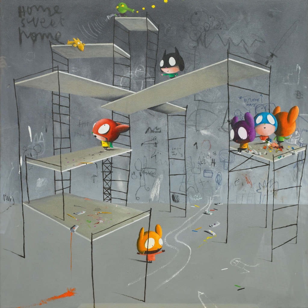 西班牙當代藝術家艾德加.普連斯(Edgar Plans)的《甜蜜的家》為他所著稱的動物英雄(Animal Heroes)系列作品,以街頭藝術與兒童插圖結合,打造出不同於既定觀念當中的英雄形象。美國當代藝術家喬納森.查普林(Jonathan Chapline)聚焦於「3D渲染」技術在當代藝術創作的實踐,他經常以早期雜誌的豪宅攝影照片注入當前的電腦繪圖技術,反向輸入虛擬概念於現實的物質世界。即將上拍的《家庭景觀》採用搶眼的大比例洋紅與靛藍色系相互衝擊,使整體畫面充滿超現實迷幻感,以達到藝術家自言的「推倒數位與現實的界線」創作理念。而法國街頭藝術家吉斯巴(Jisbar)以獨特個人風格重新詮釋藝術大師傑作,本次上拍的《態度:巴斯奇亞頭骨》同樣富含文字、口號、符號等象徵意義,提供觀者發掘新元素之樂趣,以多樣細節線索解密畫作。