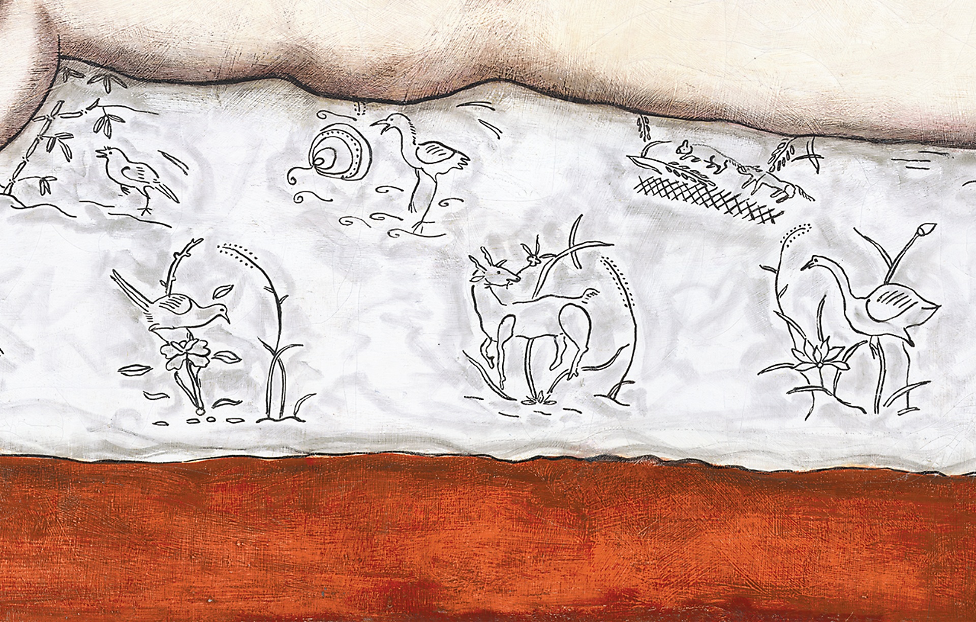 值得注意的是,若從李後主的詞回望常玉此一時其畫作上的花布,那麼似乎可以更深一層地去理解藝術家筆下的花、草、馬等等花毯圖像以及花毯與粉紅裸女之間的意象關係。諸如〈浣溪紗〉的「……紅錦地衣隨步皺……」,〈玉樓春〉的「……待踏馬蹄清夜月……」,乃至於〈喜遷鶯〉中「……啼鶯散,餘花亂……」等等以自然動植物來隱喻愛情裡的種種心緒。常玉本是南方佳公子或許亦同樣孺慕南方佳公子的李後主其藝術造詣與才氣,也因此,藝術家通過畫筆以粉紅時期的花毯與裸女來比肩李後主那恣意風流的年少芳華。當凝視作品《花毯上的側臥裸女》時,觀者或可以想像常玉一如李後主般:「臉慢笑盈盈,相看無限情。」地凝視著眼前那位女子。