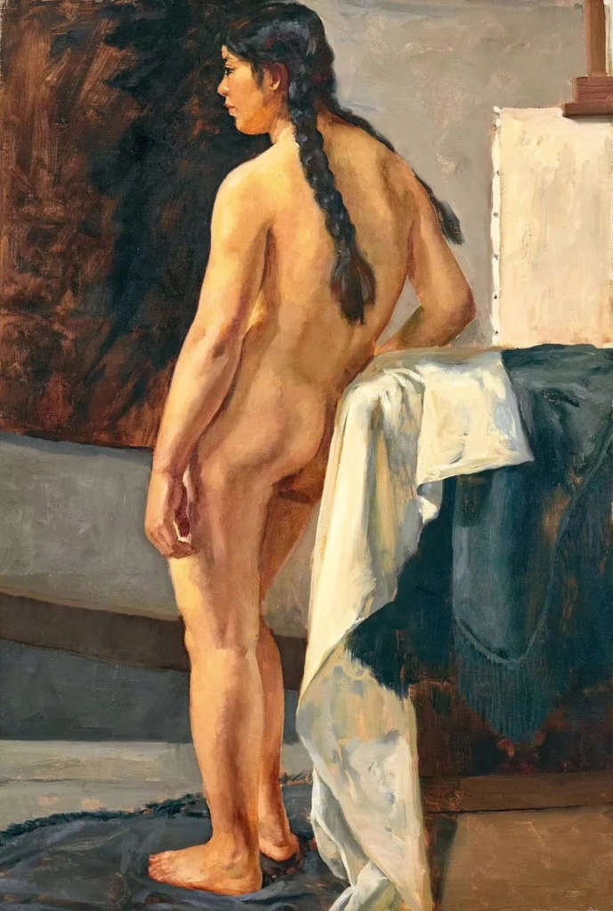 《裸女背影》完成于吳作人油畫達爐火純青的 1950 年代,出自藝術家家屬舊藏,來源有序。有別於西方學院派中過於追求完美、精心雕琢的人體造型、展現強烈骨骼和肌理的表現,吳作人在此以恣意的大筆觸,真實還原了畫中女子具生活感的體態,以及帶著生機、回首側望的神情。他在背景和中心處充分把握「光影、色彩和人體結構」的巧妙關係,將主角與不同的背景塊面進行銜接,從而強化「光的動態」。而作品中可見多達五種布料的鋪排使用:地毯、畫布、桌布、遮光布、披巾。當中的質地、色彩、光影的差異,如同對應著人體不同部位在光源下的差異,將冷暖色的細微差異充分融入,從而深化了整體造型,令主角脫穎而出,如珠璣寶石般潤澤奪目,展現人體美的真實力量。