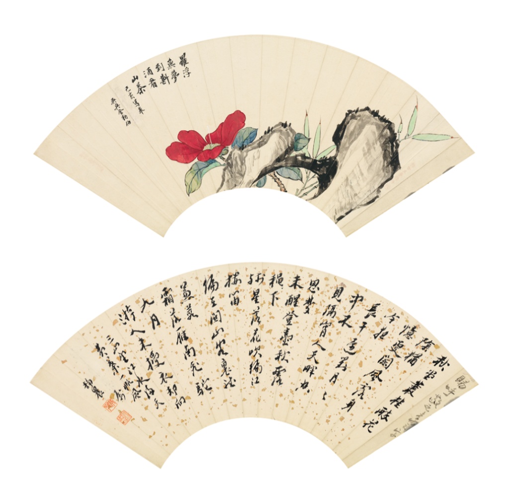 專場封面作品溥心畬《禪境遊山》取元人山水畫意,以南宗山水飄逸的文人氣韻兼糅北宗山水剛古峭勁的筆法。溥心畬少時多習宋人古法繪畫,尤工「界畫」,畫幅中段樓台屋宇的描繪用筆精細,敷色淡雅典麗。溥氏以文人畫一脈的傳承又能攻界畫工筆,畫史上罕有,本作預期迎來藏家垂青。溥氏被喻為「文人畫的最後一筆」,其對中國繪畫史之傳承與轉化亦見於溥心畬《秋江泛舟》,本件扇面風格清雅而筆法細膩豐富,深具溥氏風格代表性。另有純以水墨,取材自宋人米芾愛石成痴故事的《拜石圖》以及《松石圖》,畫題內容與斧劈皴之石都為溥氏文人氣韻之彰顯。