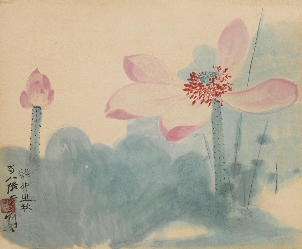 張大千《荷花》為本場領銜。淺紅淡染出組成花形、花苞,花瓣蜷卷之處構成立體感;寫蓮梗則是畫荷的主心骨,如寫大篆一筆到位,作出迎風亭立的雅致,梗上打點則錯落有致;蓮蓬用圈勾勒成團狀結實貌,花鬚蕊絲以胭脂紅細筆鉤線,直曲相間成叢,繁美而不雜亂;荷葉以大筆蘸淡花青,粗略掃出葉廓,後用汁綠層層疊染,濃淡之處顯露出荷葉隨風翻飛的自然樣態,夏日荷塘的清朗之氣溢於畫外,墨色虛實與塊面枯潤之間交織錯落;畫背戲題「紅粧出水」引自宋代王洋詠蓮詩,更顯天真爛漫的情致。