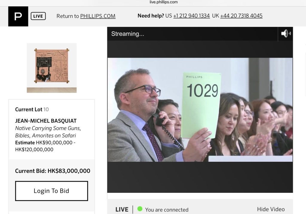 富藝斯(Phillips)於今(31)日在香港西九文化區的亞洲總部舉辦2024春季「現代及當代藝術」晚間拍賣,由亞洲區主席陳遵文(Jonathan Crockett)舉槌,本季晚間拍賣有高達八成的作品為首度現身拍場,匯集藍籌藝術家與風格新穎的新晉藝術家之作,共計有24件作品上拍、23件成交,成交率為95.8%,成交總額達2億1,022萬港元,較上一季晚拍成交額增長10%。本場更順利拍出本季香港最高價成交的現當代藝術品,為尚-米榭.巴斯奇亞(Jean-Michel Basquiat)的《亞摩利人獵遊》(Native Carrying Some Guns, Bibles, Amorites on Safari),以9,873.5萬港元成交價稱霸全場,為巴斯奇亞的輝煌拍賣紀錄再添一筆亮眼註記。
