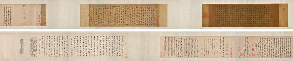 宋仁宗(1010-1063)趙楨為宋代第四位皇帝,在位42年,為宋代在位時間最長的一位,有著「仁宗盛治」的美譽。其書法作品傳世難得一見,本幅於卷首有「御書之寶」及「寶翰之章」;卷末有「宣和」、「政和」二璽、「御前之印」。第二段則為宋高宗(1107-1187)趙構所臨,為南宋第一任皇帝,熱衷於書畫藝術,書法造詣高。相較於宋仁宗,宋高宗的書法作品較多存世。本幅首尾兩端下方各鈐有「紹興」印。