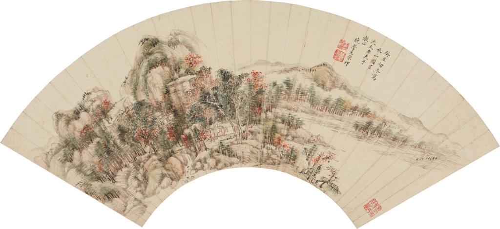 第三高價為王原祁《秋山圖》,重心至於左方,如雲團般的山巒中,懷抱數間房舍,墨綠、楓紅、淺絳等各色樹叢圍繞,右方有淡淡的遠景。扇面裱褙處有宮本昂「宮子行同弟玉父寶之」、「宮子行玉父共欣賞」等鑑藏印,以及小萬柳堂主廉泉的「南湖居士」印。預估價24萬至55萬港元,成交價384萬港元,近高估價7倍。