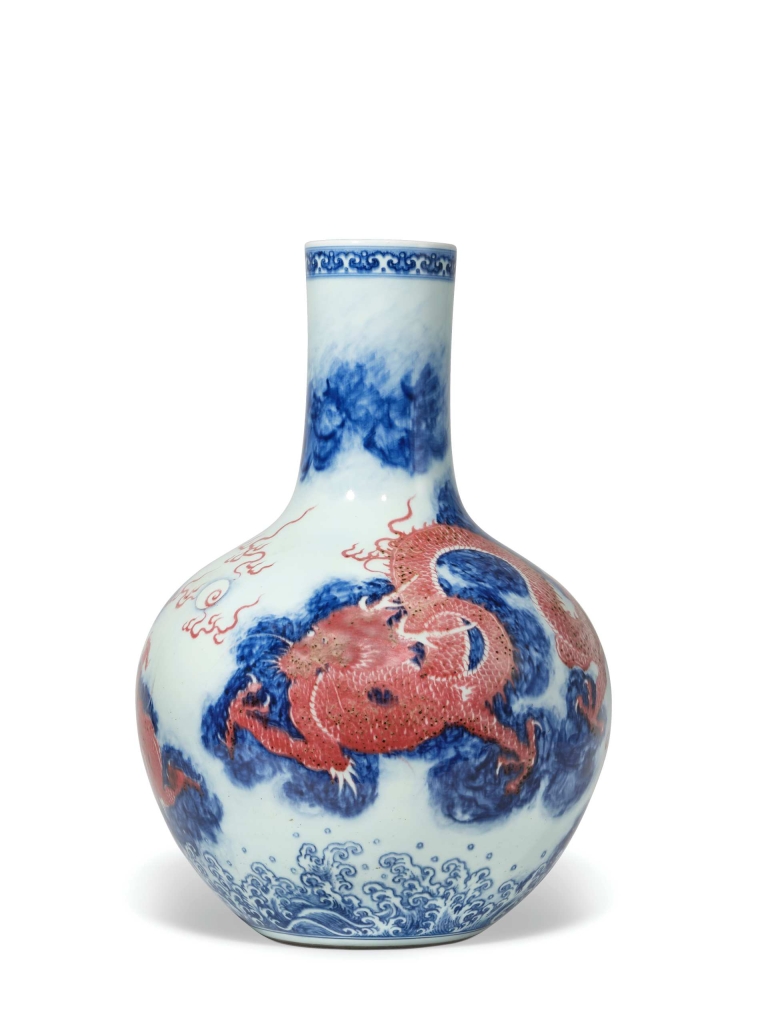 紐約邦瀚斯 清乾隆《青花釉裡紅雲龍紋天球瓶》,高55.2公分,估價40萬至60萬美元,成交價370萬美元。圖/紐約邦瀚斯