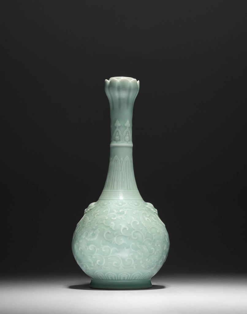另一件吸睛之作為清雍正《粉青釉刻花鸞鳳紋花口長頸瓶》,呈現出雍正皇帝高雅的品味。本瓶取花口長頸狀,圖作鸞鳳螭龍紋,靈感皆取自古代青銅器;瓶身滿施粉青釉,則是追摹趙宋單色釉盛世之風。由造型至釉色,都可以到到雍正皇帝的慕古之情。紋飾清晰可見,卻又不喧賓奪主,與粉青釉呼應出高雅的氛圍。本件估價為40萬美元,以逾四倍的175萬4500美元成交。