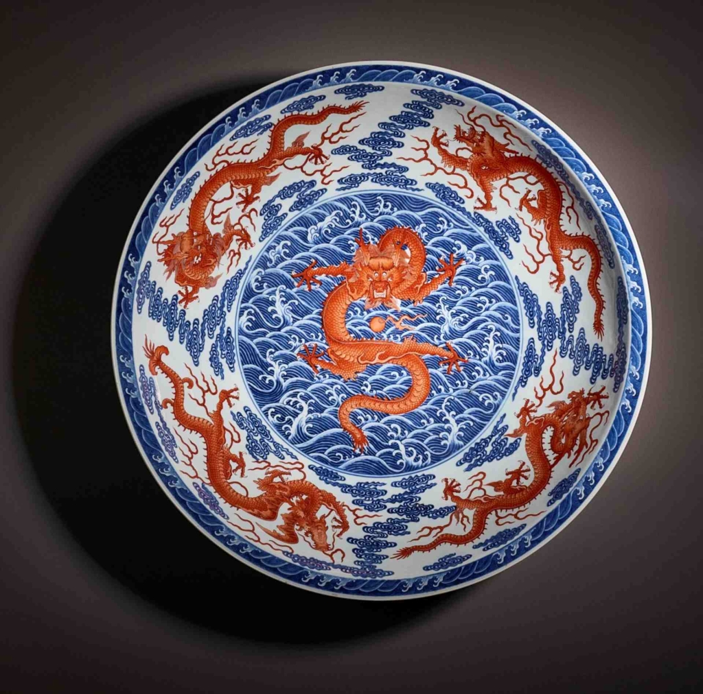 封面拍品清乾隆《青花礬紅彩龍紋大盤》六字篆書款呈現了乾隆皇帝的品味,極具皇家大氣的五爪紅龍與青花雲海形成強烈對比,底足青花「大清乾隆年製」篆書款鋒勁,為典型的乾隆中期官窯標準款識。此盤結合了釉下青花與釉上礬紅的二次燒造,工藝難度極高,傳世品亦少。品相精美又罕見的拍品,向來是市場寵兒,本件估價120萬至250萬美元,成交價277萬2500美元。