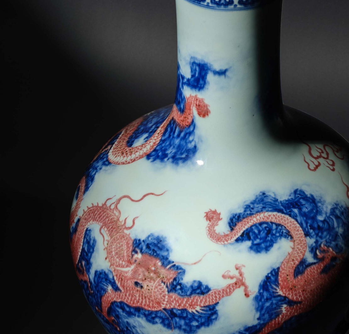 清乾隆《青花釉裡紅雲龍紋天球瓶》除了在開拍前有充分的話題性,本身的藝術性也引人注意。本瓶器型份量十足,紅色的龍紋遒勁地盤踞於瓶腹之上,筆墨有如南宋陳容筆意。其紋飾與北京故宮博物院藏同款天球瓶大致相合,僅細微之處有所不同,因此推測可能為成對製作。