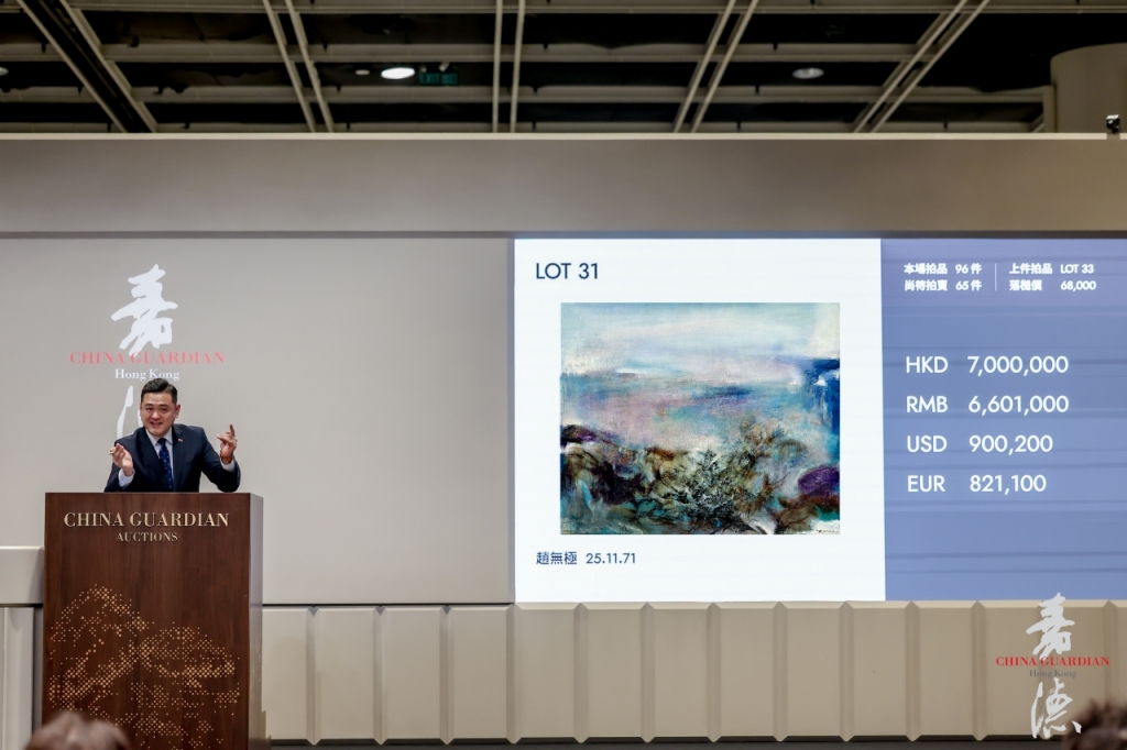 本場以拍賣圖錄封面的趙無極巔峰時期作品《25.11.71》領銜,此作曾於2023年杭州中國美院舉辦的「大道無極:趙無極百年回顧展」展出,並被特選為五件宣傳海報之一,以834萬港元成交價榮登本場榜首。1971年正逢趙無極為照顧病妻而減少創作,在同時受到詩人好友亨利.米修(Henri Michaux)的建議下重拾中國水墨創作,完成於同年底的《25.11.71》體現出藝術家重新建立起對東方傳統美學的深刻探索與連結。