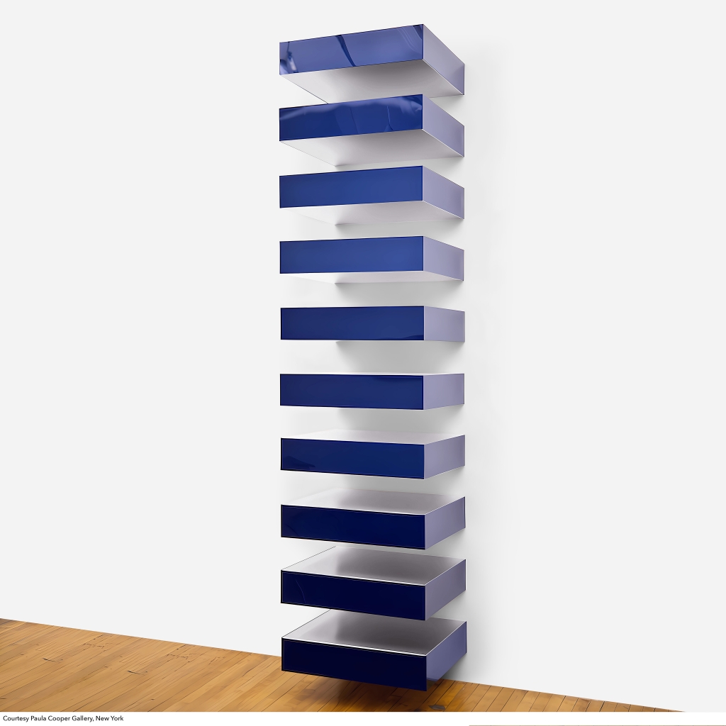 唐納德.賈德(Donald Judd)的《無題》為一組十件上彩的不銹鋼所組成,以工業材料與重複工法反映賈德希望去除藝術家痕跡的概念,並拓展極簡主義形式的美學可能性,展示以最克制的材料所表達出的視覺張力和詩意共鳴。此作以429.5萬美元成交,為本場第三高價。