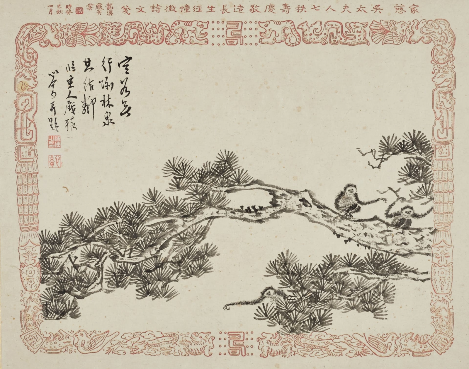 上款「嚴母吳太夫人」即著名佛教信士嚴笑棠之母。嚴笑棠,本名堃,福建龍溪人,篤信佛教,曾隨侍弘一法師,渡臺時,母親因年事已高,且奉佛在家,不願離鄉。嚴氏夙懷儒慕,1953年,逢吳太夫人七秩壽辰,嚴氏建長生經幢,雕刻佛經,並遍徵題詠,為親祈壽,溥儒是冊即因此作,所用箋紙亦嚴氏特製,四端印製經幢、鳥獸裝飾,並題「家慈吳太夫人七秩壽慶敬造長生經幢徵詩文箋,龍溪嚴笑棠,時癸巳(1953)秋七月。」1956年,溥儒又為其作〈金剛經壽母冊〉。