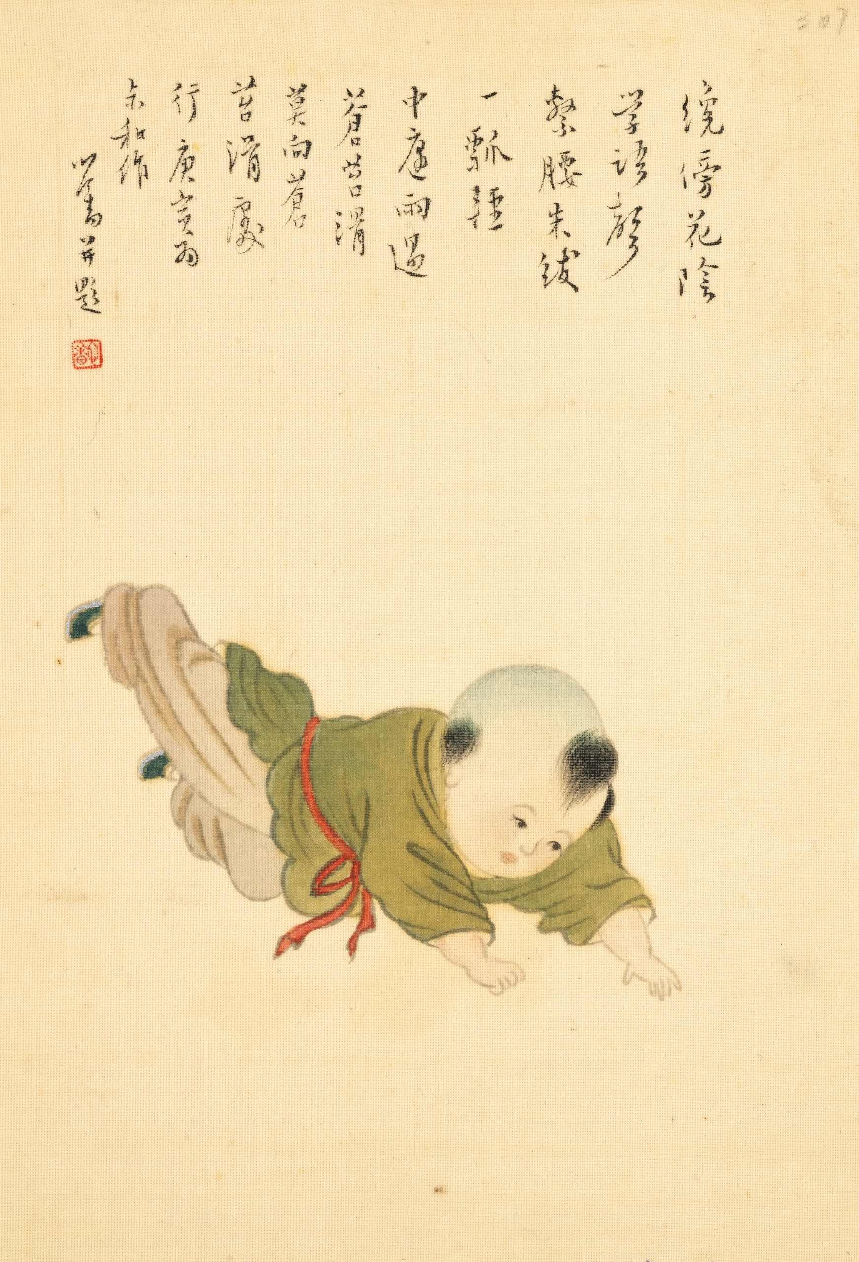 溥儒《蒼苔滑嬰圖》精緻可人,題識: 纔傍花陰學語聲,繫腰朱紱一瓢輕。中庭雨過蒼苔滑,莫向蒼苔滑處行。庚寅(1950年)為尗和作,心畬並題。曾著錄於1993年《溥心畬先生書畫遺集》(下),臺灣商務印書館。