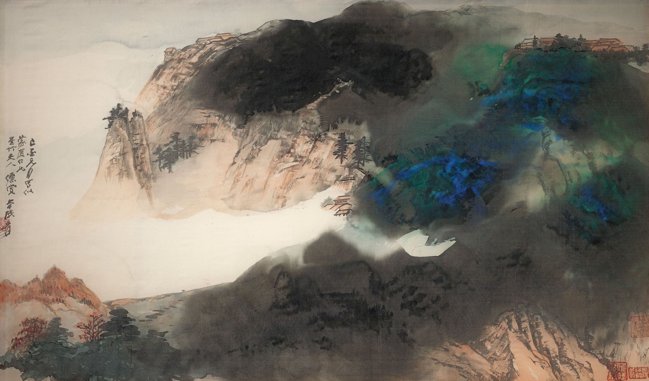 《雲山居隱》創作於1969年,是張大千盛期所作潑墨潑彩中具有別樣意味的一幅。全作無論在技法還是構圖上都達至一種典雅的均衡。珍珠白一般的日本絹布上,墨韻悄然流淌,於無形中隱約見有形。石青石綠顏料凝結在山巔,如雨後初霽,嵐氣微現。畫面左側,大千以意筆寫成山林宮殿,仿如晨光初起,霧氣彌散後之所見。細看《雲山居隱》,原來大千所用乃未裱絹布,不加處理即潑之寫之,墨彩與絹本交相輝映,淡墨處輕靈,重彩處厚重,乃同類題材所見之罕例。1960年代末,正是畫家潑墨潑彩創作的巔峰時期,大千了無拘束,以前人未有的勇氣和魄力開疆闢土,在材料和技法上更是勇於創新,無所不用,常常驚歎世人。本作在材料上的創舉,正是此時期畫家敢於推陳出新的最佳例證。