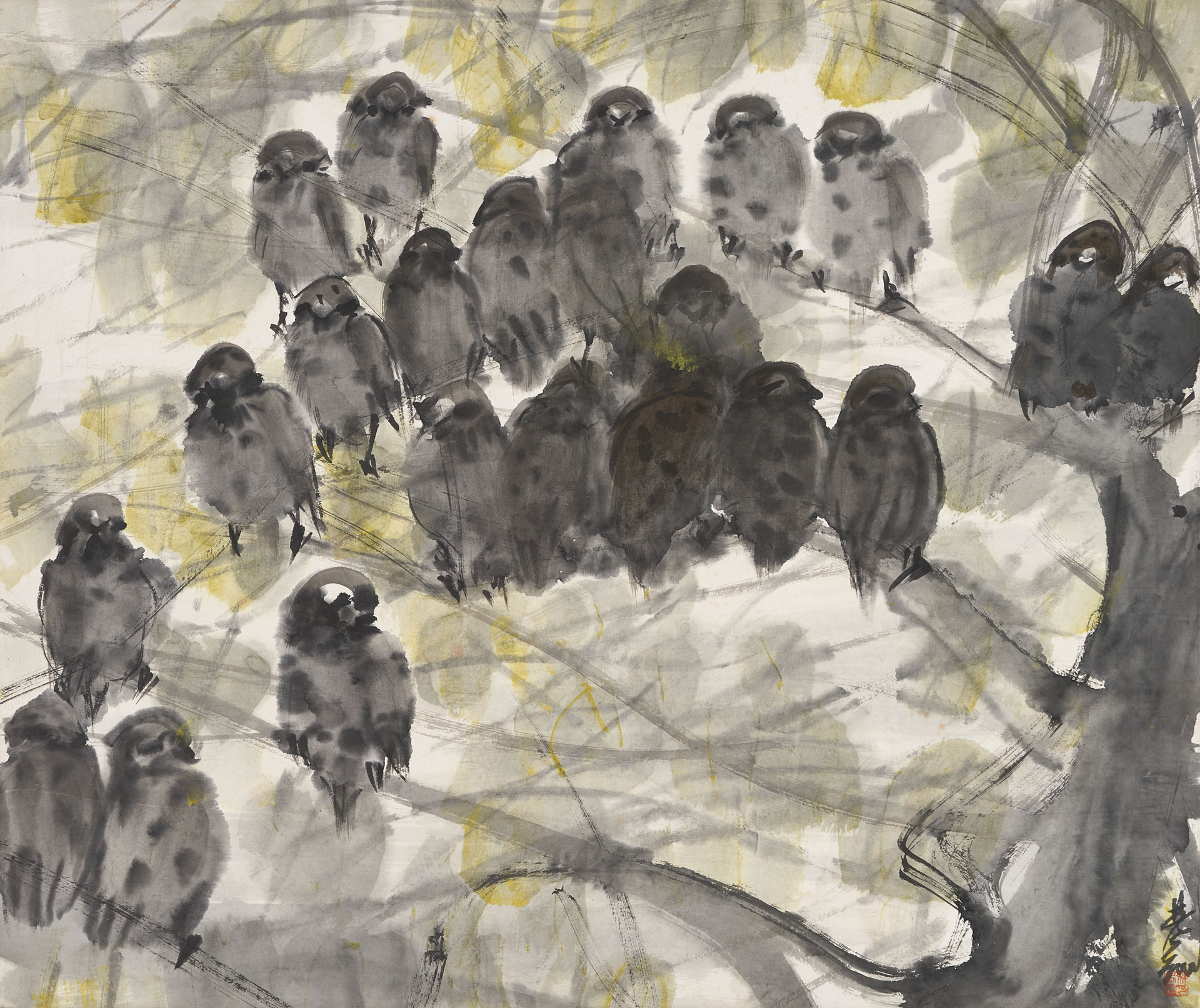 本輯美國重要私人珍藏之林風眠佳作四幅,《諸雀和鳴》(拍品編號668)、《村舍》(拍品編號669)、《打漁殺家》(拍品編號670)以及《敦煌伎樂》(拍品編號671),完成於林風眠藝術創作的巔峰期,1940至1950年代,都是畫家千錘百鍊、最為得心應手的題材。這四幅中,以《敦煌伎樂》最為令人震撼,在130公分高、160公分寬的畫面上,畫家極盡巧思地繪製了10位姿態各異、飄逸傳神的敦煌樂人。在已知的風眠先生傳世作品中,本幅不僅為公私收藏中人物最為眾多的一幅,毫無疑問,也是目前釋出市場最為碩大而精彩的傑作。
