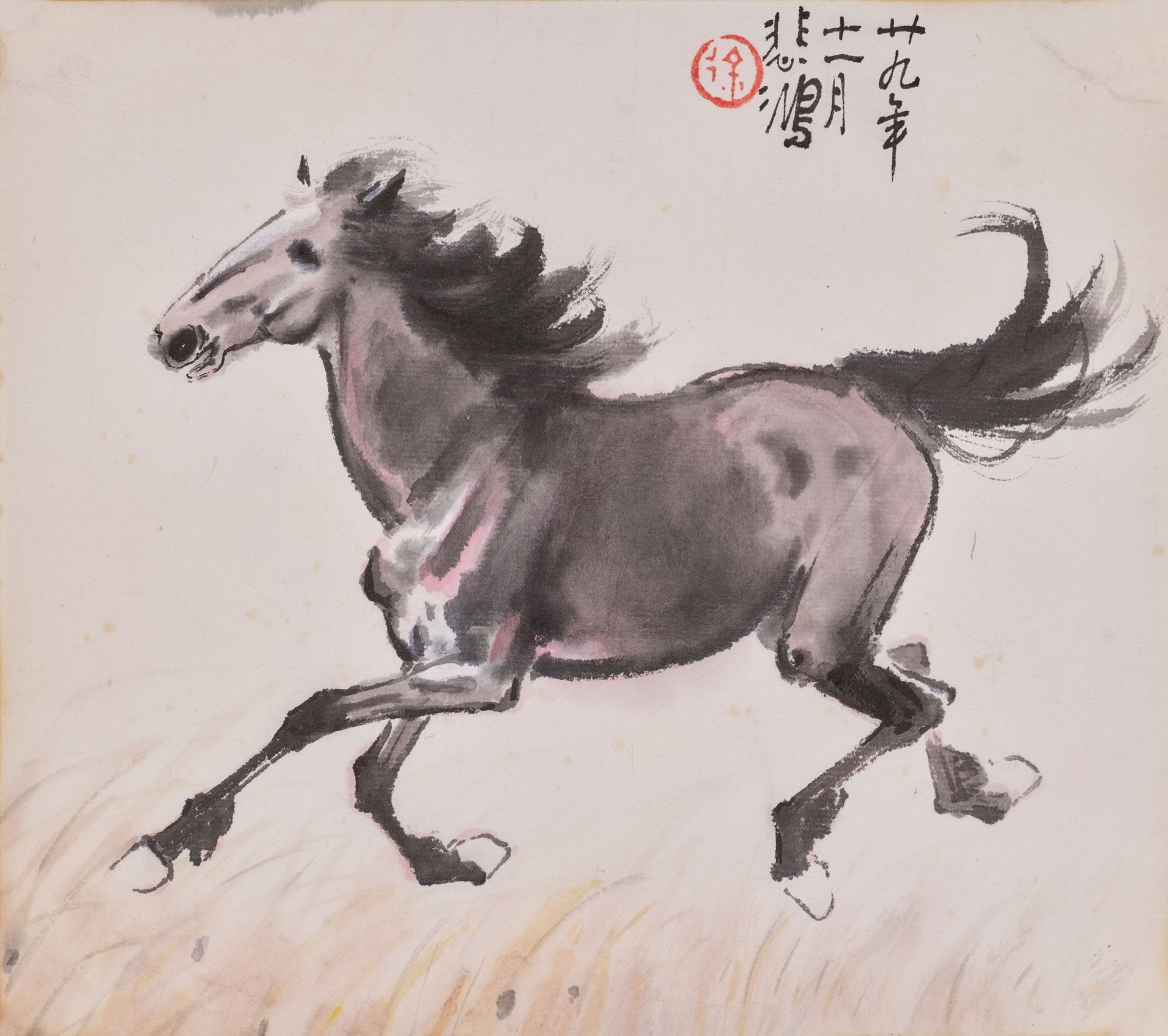 法因法師(1927-1992),俗名韓奇光,又號詩雨,其叔父韓槐準(1892-1970)乃星洲知名瓷器專家、歷史學家,與徐悲鴻交情深厚。韓槐準之愚趣園乃星洲文人雅士燕集之所,因叔父關係,韓奇光得以結識許多藝壇名宿,其收藏不乏徐悲鴻、趙少昂、劉海粟、程十髮等名家作品。本輯星洲私人珍藏之悲鴻精巧佳作,成於1938年至1940年間,時悲鴻正奔走南洋,積極為抗戰籌款。奔馬、雄鷹、風竹、喜鵲皆畫家筆下最喜愛與最擅長之題材。其中作於1940年的《胭脂馬》(拍品編號720),未及盈尺而具千里奔騰之勢,可知悲鴻以畫馬聞世,絕非虛名。