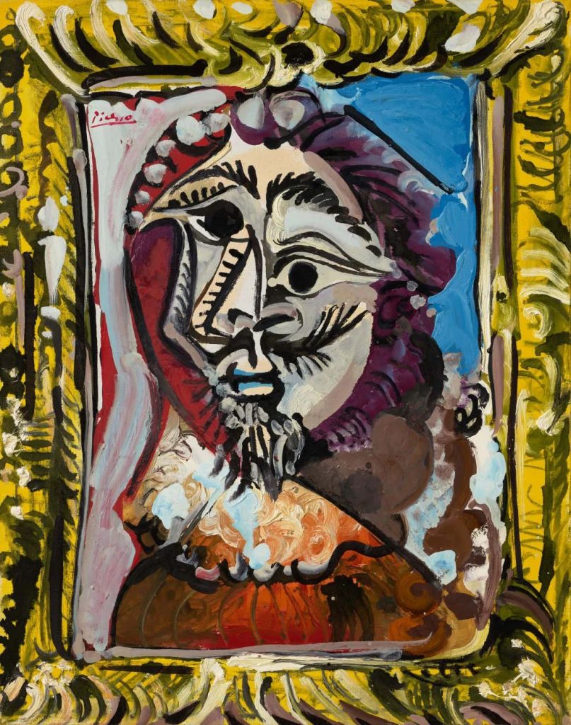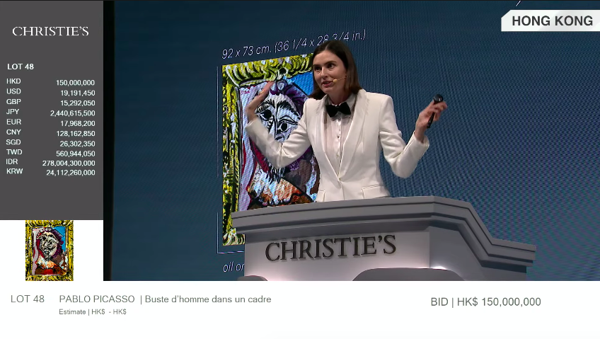 畢卡索鉅作《畫框中的男子半身像》首次上拍,為電影明星——007扮演者史恩.康納萊(Sean Connery)舊藏,此作為畢卡索晚年最經典的作品之一,也是「火槍手」系列中傑出的作品之一。史恩.康納萊於2020年逝世前,將自己很大部分的財產分配作慈善用途。這件畢卡索的拍賣部分收益也將撥予史恩.康納萊慈善基金。《畫框中的男子半身像》在拍前已獲擔保,以估價待詢上拍,現場1億港元起拍,1.5億港元落槌在佳士得亞太區二十及二十一世紀藝術部聯合主管Cristian Albu手中電話,1.749億港元成交,為本場第二高成交價作品。