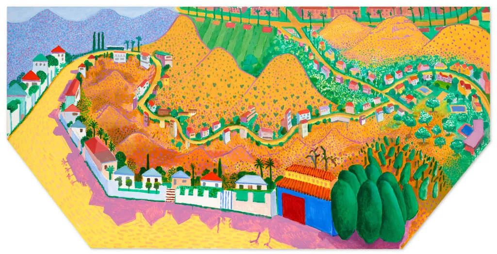 大衛.霍克尼(David Hockney)六邊形的畫作系列以繁複的空間概念,創作了霍克尼最著名和精彩的一批作品。《尼科爾斯峽谷三》為霍克尼1980年的著名作品 《尼科爾斯峽谷》(Nichols Canyon)的靈感延續。當時,藝術家每天駕車往返的好萊塢山尼科爾斯峽谷頂部通往他家的蜿蜒道路。畫作細節滿滿,乾淨利落又錯綜複雜。畫面構圖右側甚至有霍克尼自己的家,門前還有藍寶石般的泳池。此作以7,500萬港元起拍,8,000萬落槌在香港委託的8037號牌,終以9,480萬港元成交,是第四高成交價作品。