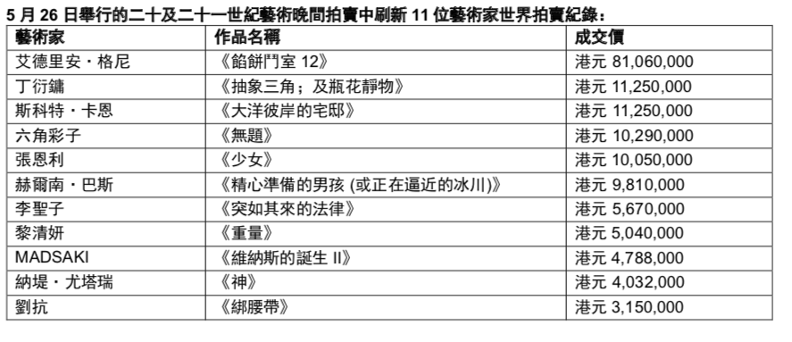 此外,藝術家丁衍鏞《抽像三角;及瓶花靜物》以1,125萬港元成交,打破藝術家拍賣市場紀錄。黎清妍也是香港炙手可熱的新興藝術家,此件作品由書面委託、電話委託和現場買家競投,400萬落槌,大幅超過藝術家之前的拍賣紀錄,504萬港幣成交。斯科特.卡恩作品以1,125萬港元成交,打破藝術家拍賣紀錄。尤塔瑞是泰國新鋭藝術家,今晚他迎來了自己最新拍賣紀錄,此作被佳士得亞太區二十及二十一世紀藝術部聯合主管Cristian Albu競得,403.2萬成交。賀南·巴斯是當今最受歡迎的年輕藝術家之一,作品以380萬起拍,很快超過了500萬,最後以780萬由香港電話競得,打破藝術家拍賣紀錄,以981萬港元成交。