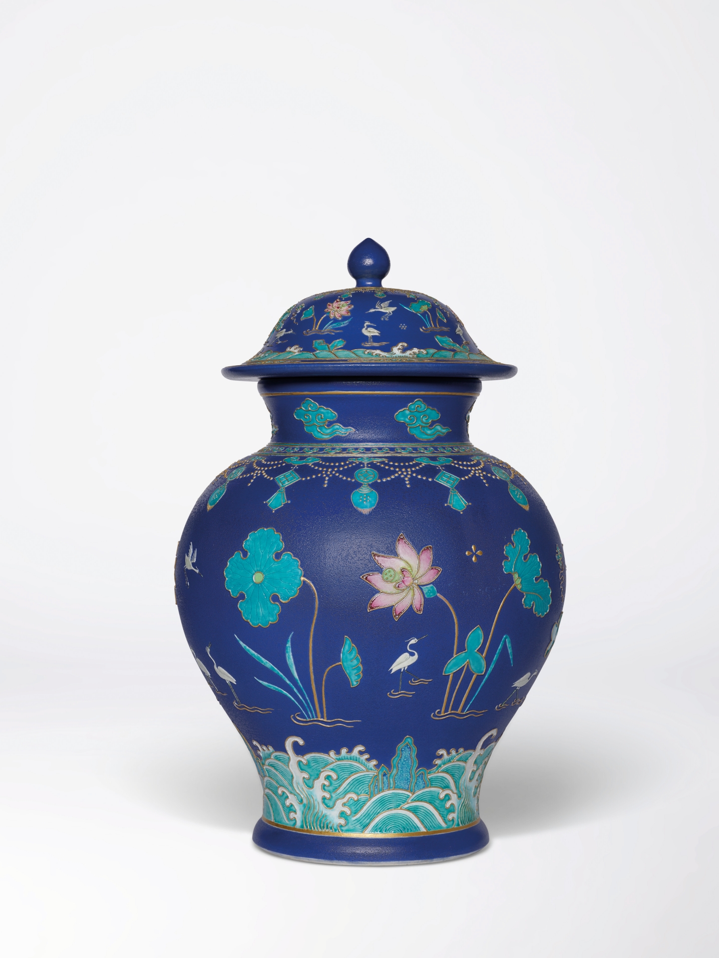 - 清乾隆《粉彩仿琺花一路連科紋蓋罐》,高45.7公分,估價1200萬至2000萬港元,成交價1485萬港元。