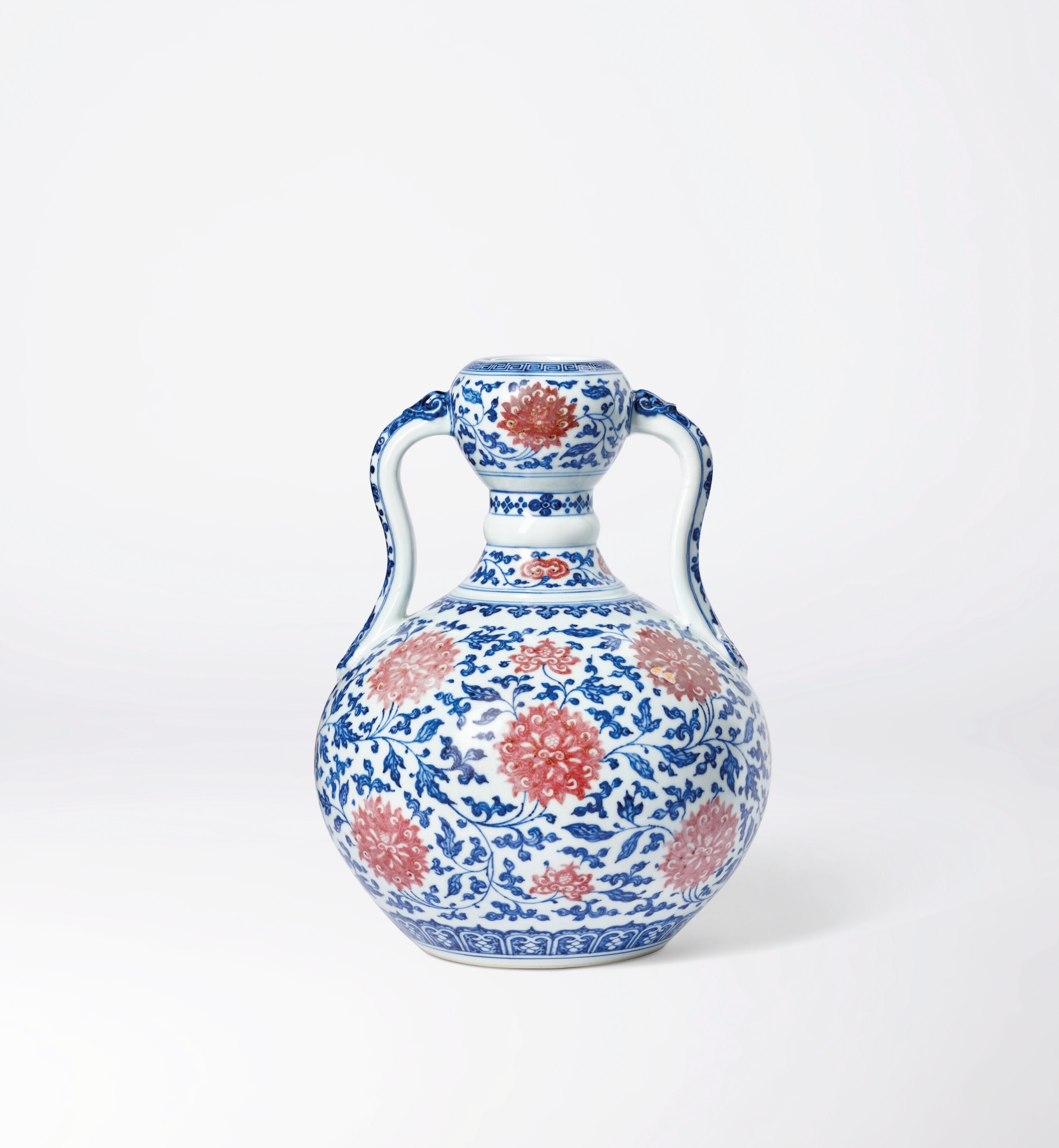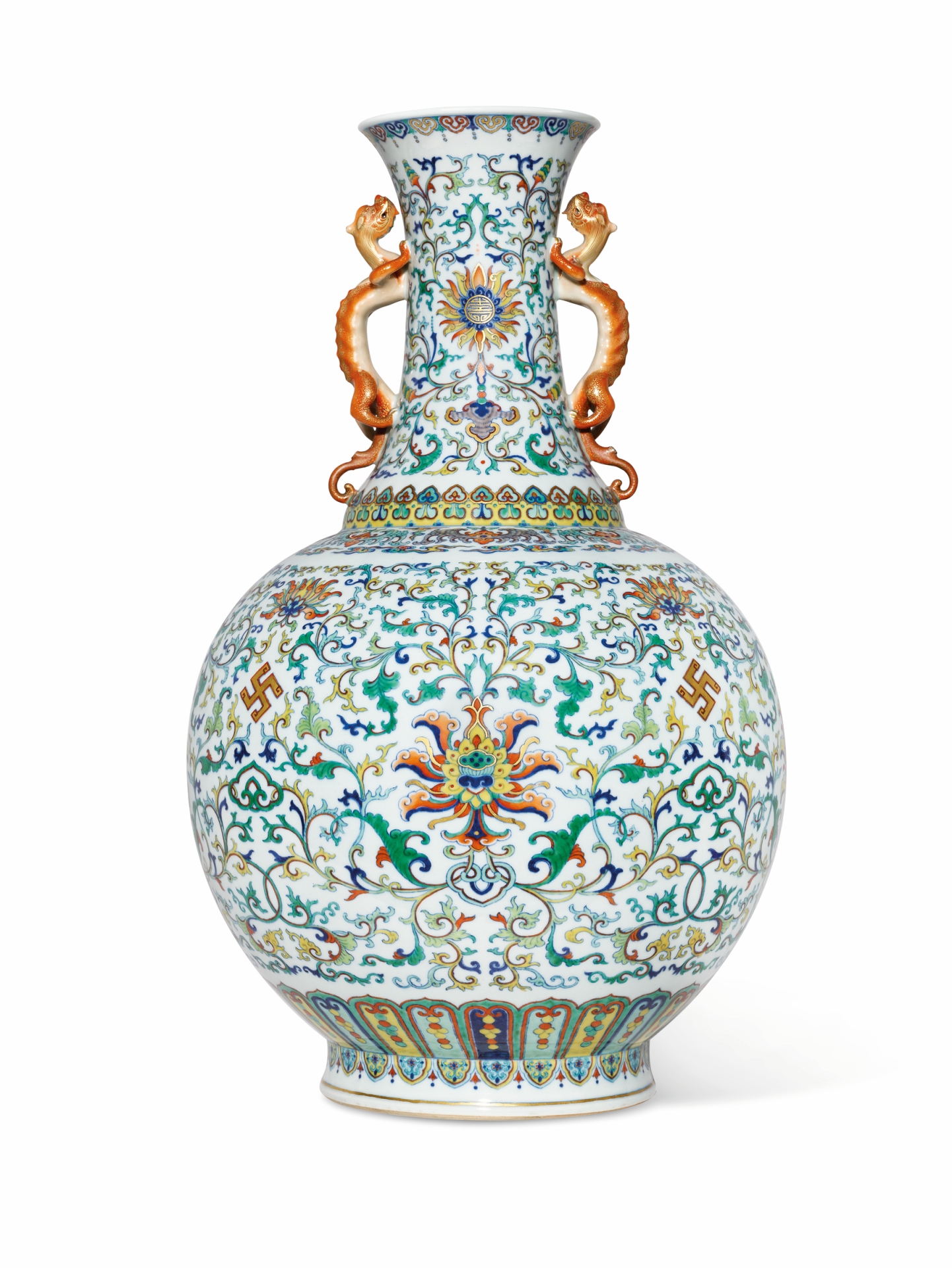 傳世鬥彩瓶中,器型敦碩如本拍品者屈指可數。本件工藝精美,瓶身以四朵造型華麗優美的蓮花為主,下方飾以鎏金「卍」字紋,四周飾以纏枝蓮紋,瓶肩飾以一圈別緻的蝙蝠紋與雲紋,瓶足上方以一圈蓮瓣紋點綴。頂部高瓶頸前後均飾以一朵蓮花,花芯中心繪以鎏金「壽」字紋,下襯靈芝紋,四周圍以纏枝蓮紋點綴,上下飾以如意雲頭紋為界,兩側配以栩栩如生的描金礬紅螭龍耳,更添華貴。
