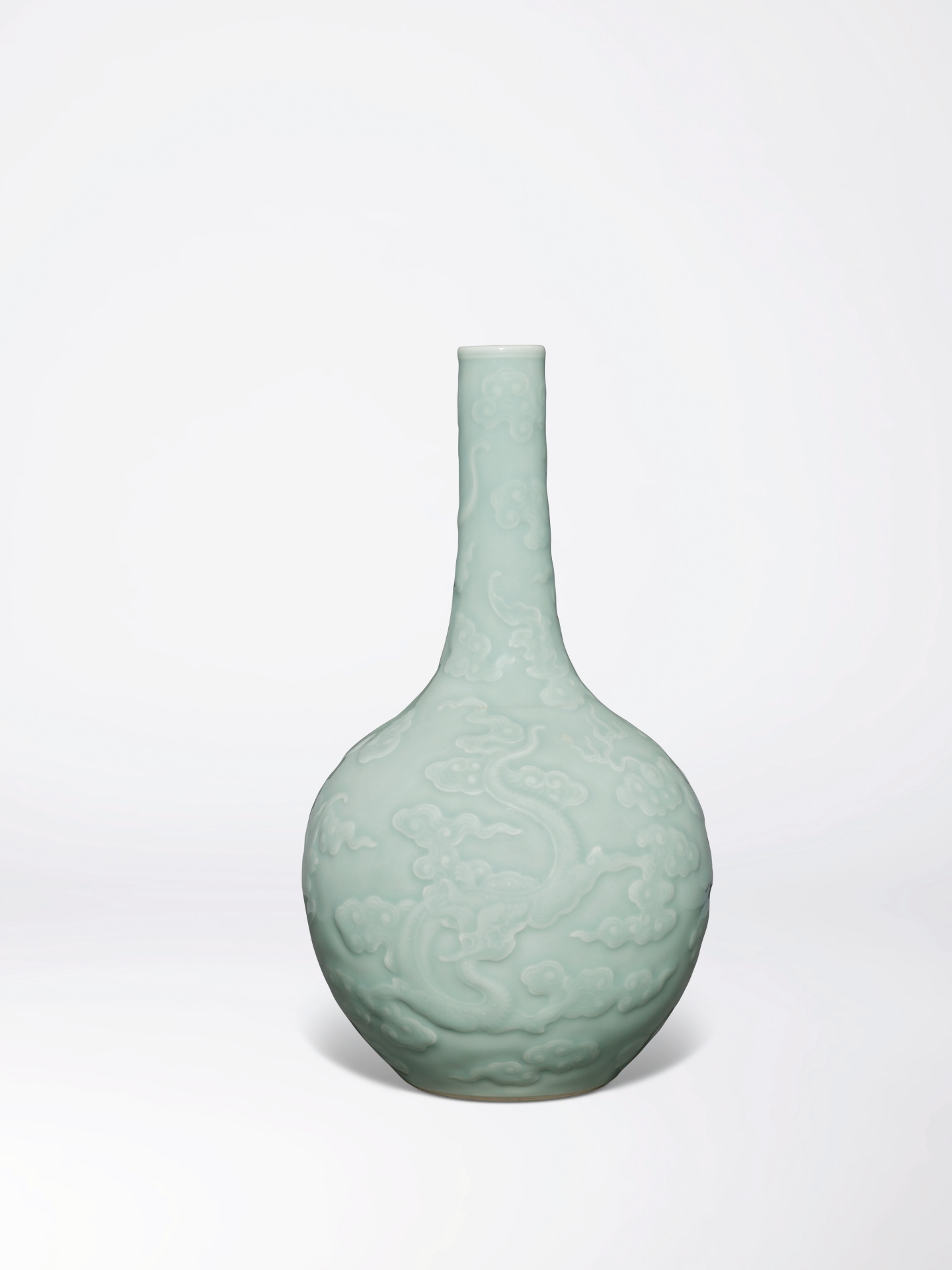 - 清乾隆《粉青釉浮雕蒼龍教子長頸瓶》,28.3公分,估價1000萬港元至1800萬港元,成交價1725萬港元。