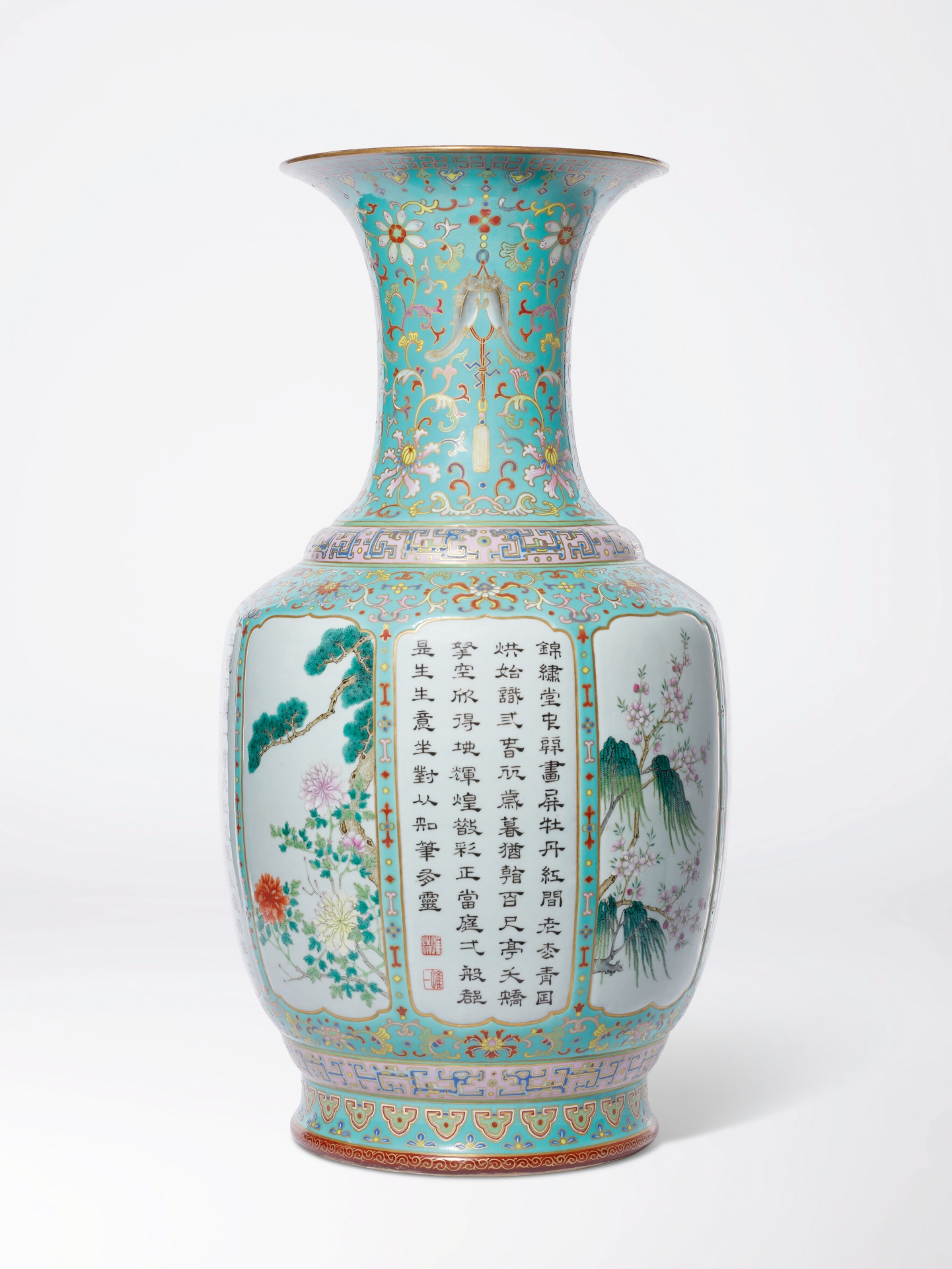 - 清乾隆《松石綠地洋彩開光御製詩四季花卉圖大瓶》,高78.3公分,估價800萬港元至1200萬港元,成交價1005萬港元。
