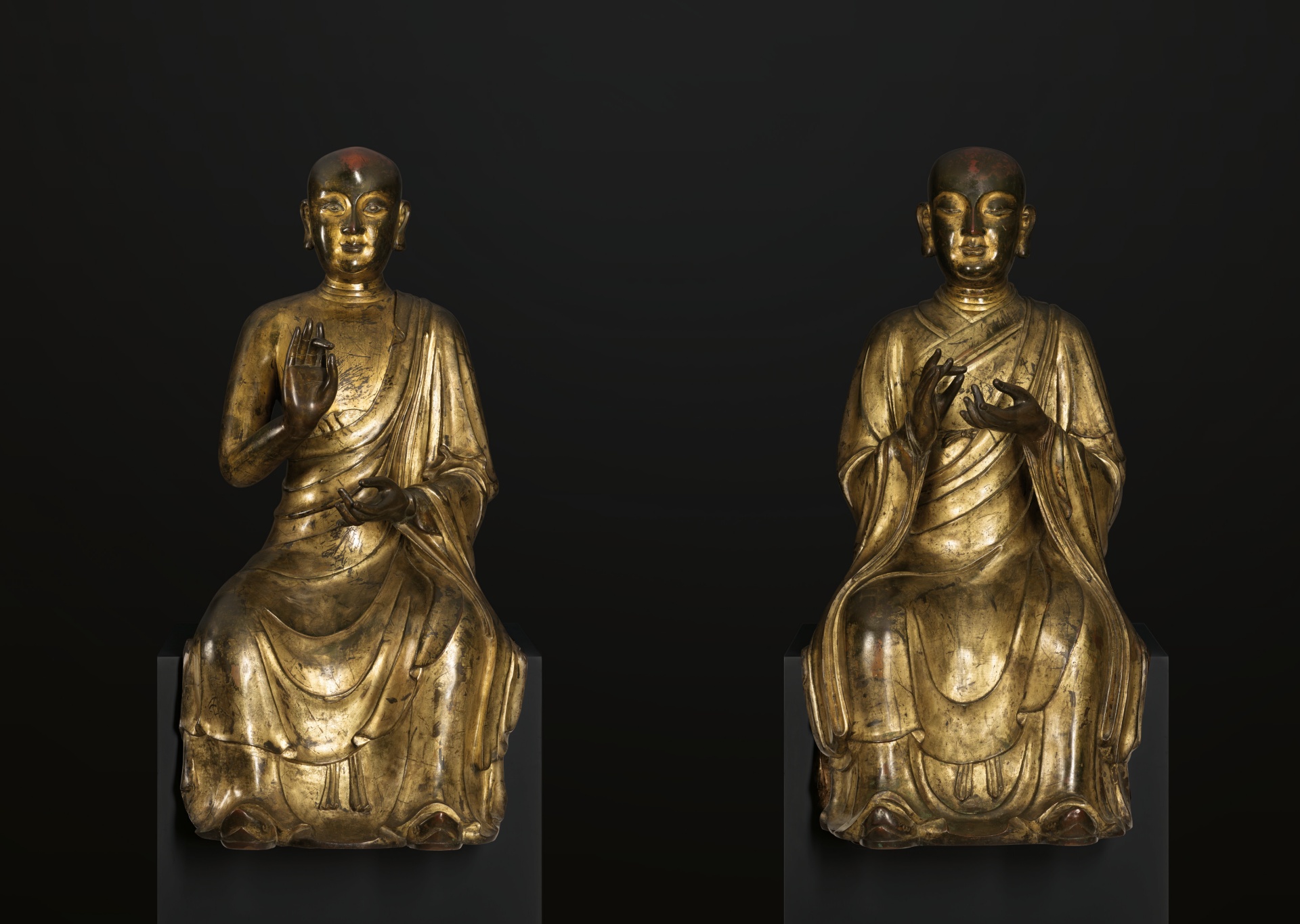- 元/明初《鎏金銅羅漢坐像》一對,85、87.6公分,估價1200萬至1800萬港元,成交價2445萬港元。