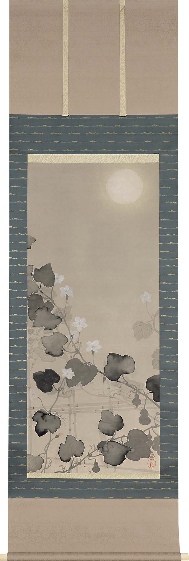 橫山大觀《夕顏》,有別於對大觀(1868-1958)印象中其富士山景所象徵的氣宇軒昂、具有強烈精神力量的畫境;而是展現出對物象細緻入微的觀照,畫中三四個葫蘆雖小卻已初有形廓,提示出此為由夏入秋的季節變換之景。這不免令人想到松尾芭蕉的名句「夕顔や秋はいろいろの瓢かな」,展現妖豔之美的夕顏,到了秋天就化作詼諧的葫蘆瓢。據落款判斷,本幅應為明治42年(1909)大觀41歲前後的作品,曾著錄於美術年鑑社昭和60年(1985)出版之《歴史を築いた日本の巨匠 第一卷 橫山大観》。