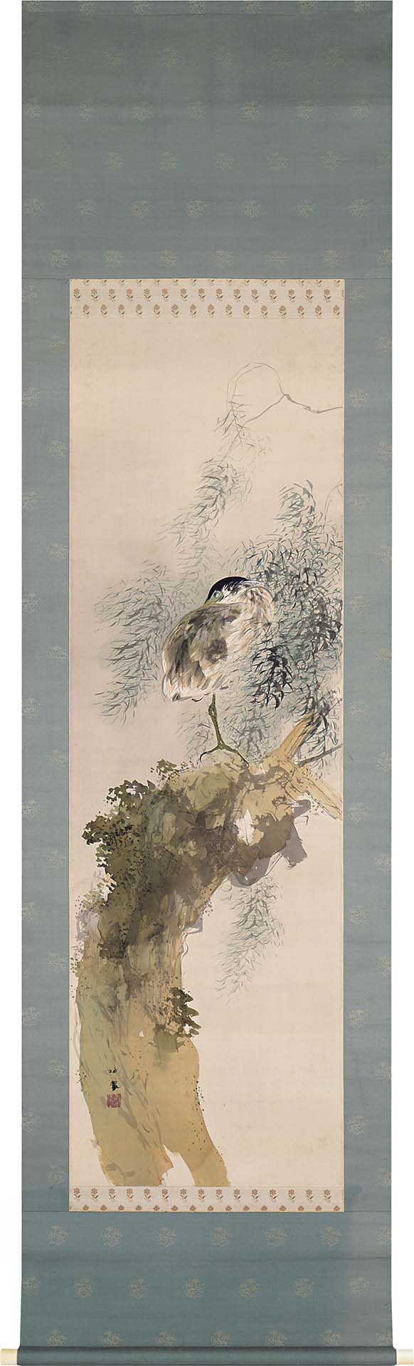 竹內栖鳳《柳鷺》,一鷺單腿立於柳樹,背對著右側吹來的風。隨風柳葉多以露鋒筆尖描繪;樹幹則以幾乎不著筆跡、渲染之法來表現。從畫風及落款的特徵推斷,本幅創作時間應為大正7年(1918),可作為栖鳳(1864-1942)約50歲常常運用之彩色法特徵代表作。一隻鷺的畫題寓意「一鷺通曉一路」,又因鷺鷥向天高飛之際高鳴,而有著「一路功名」之吉祥祝願,成為廣受歡迎的圖式。