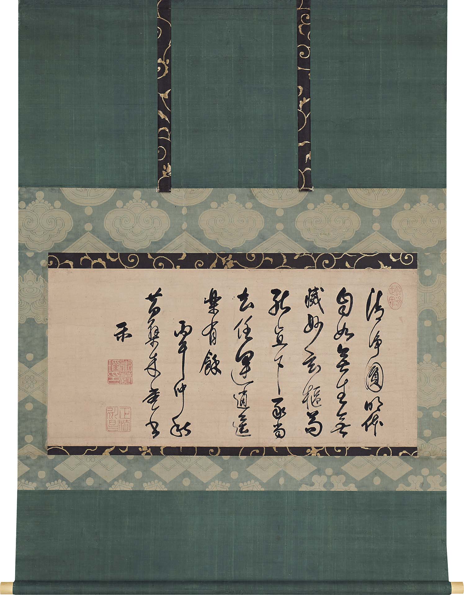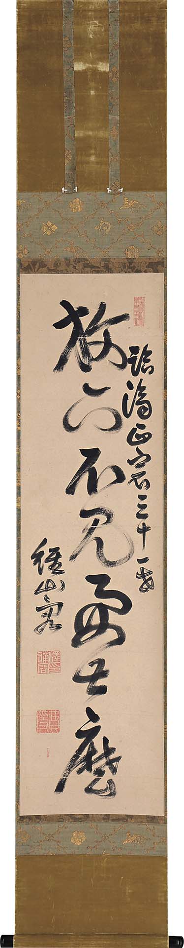 黄檗費隱《放下不見要甚麼》,一行書筆力沉雄、氣象恢廓。此種風格為彼時最新的「唐樣」(中國樣式),也為日本書法帶來莫大影響。黃檗費隱(通容,1593-1661)是活躍於明代末期的臨濟宗僧人,祖籍福建省福州府福清縣,有嗣法弟子64人,以隱元為首。該作附有江戶時代前期畫僧百拙元養題寫的鑑定證明書,側面印證了費隱書法歷來受到的珍視。