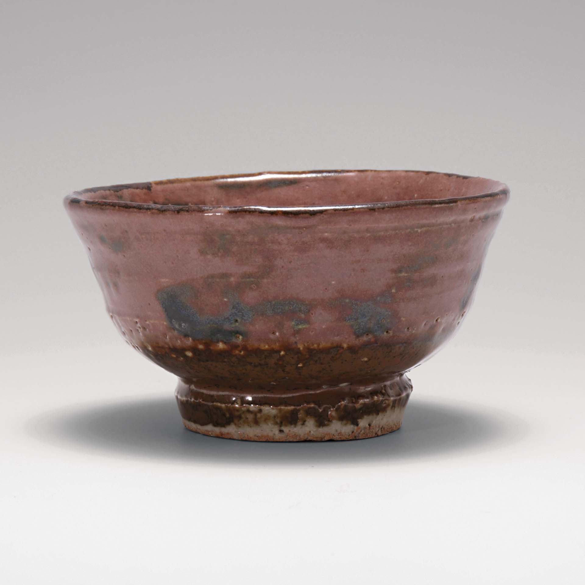 河井寬次郎《辰砂碗》。寬次郎(1890-1966)是1920年代「民藝運動」的宣導者之一。民藝運動者們著眼於日常生活,相信在「手工」生產之物,才能見到自由健康的美。本品穩重又不加修飾的造型,有著只有手工製作才能產生的韻味。寬次郎自製作陶藝初期便喜用「辰砂」釉(一種銅被還原後呈現紅色的釉藥),本品紅色的發色狀態也唯有他才能完成。