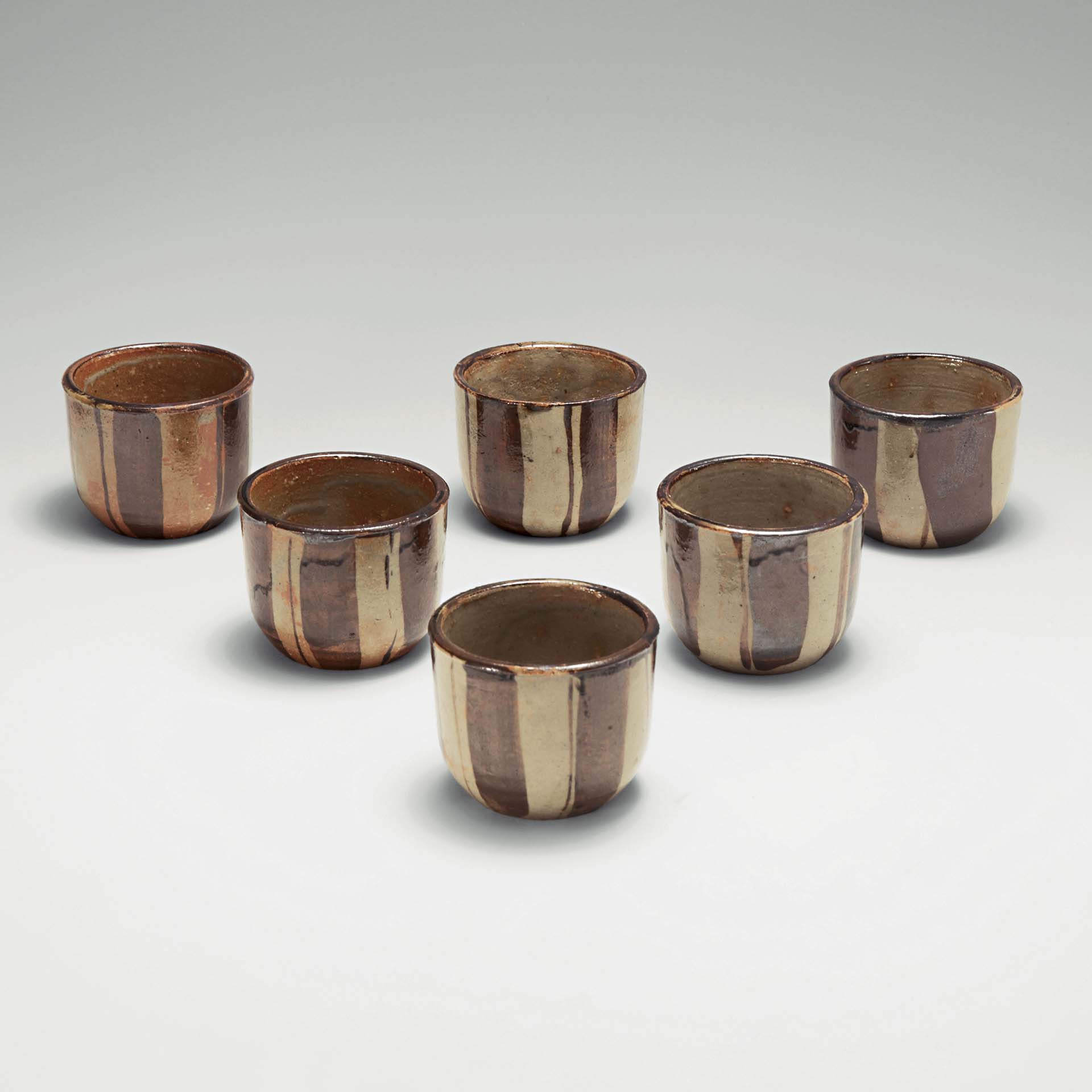 北大路魯山人《麥稭稈繪豬口(小磁酒杯)》六件一組。從這組小酒杯亦能感受到魯山人(1883-1959)所言:「食器是料理的霓裳。」以食器襯托出對料理的考究此一意念。「麥稭稈」乃指豎線條紋樣好似麥桿,本品細粗線交互掩映,其對比耐人尋味。除此紋樣,魯山人也喜歡在茶碗、向附、酒器等上畫類似有平紋和粗豎條紋的圖樣。作品箱盒由魯山人晚年指定的指物師前田友齋製作。此外,箱蓋題字是負責魯山人晚年展覽會的善田喜一郎所書。