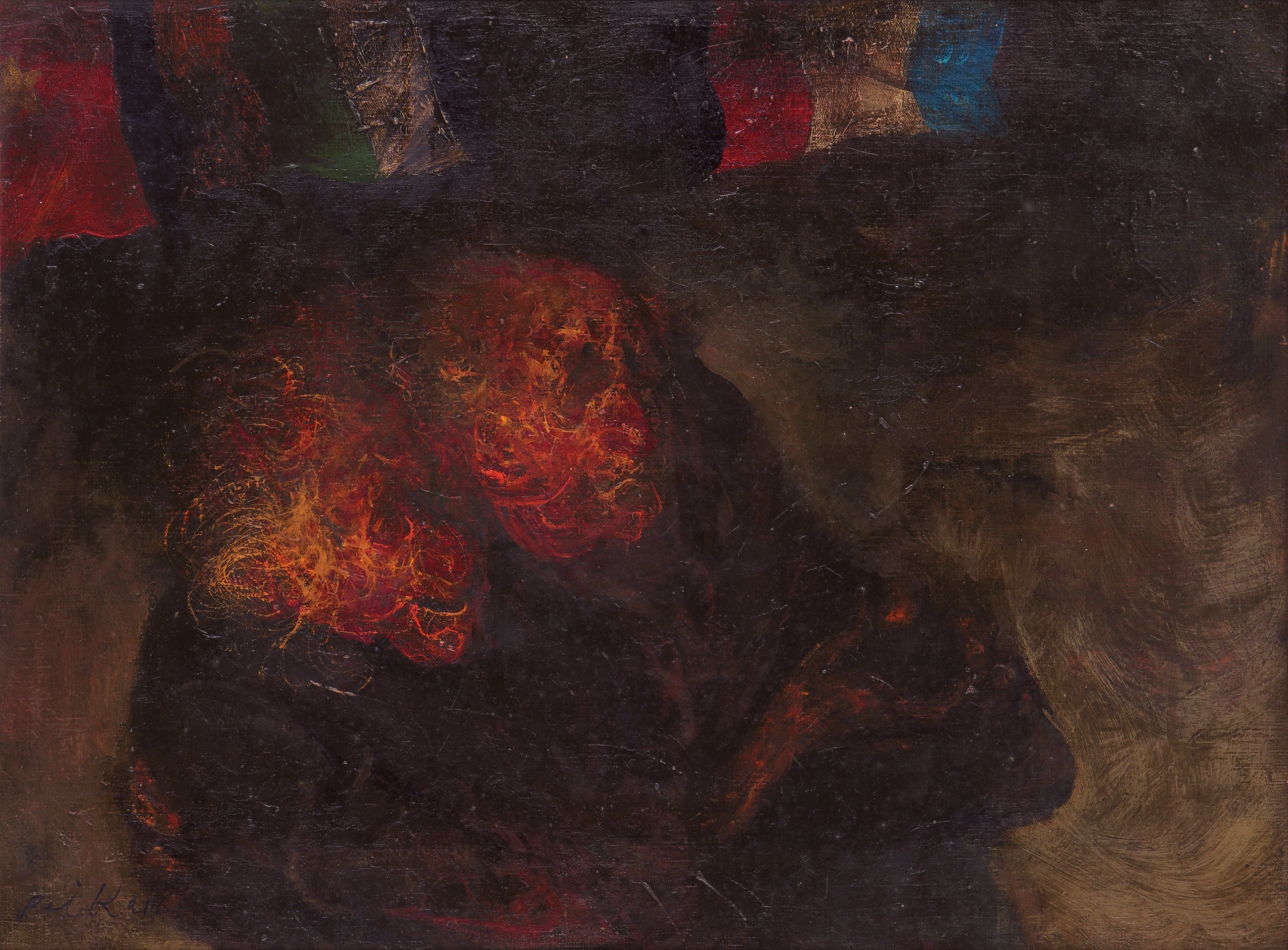 說起鴨居玲(1928-1985),腦海中便會浮現出在昏暗的畫面上描繪老婆婆和自畫像的作品吧。人氣畫家在創作上的苦惱,在其作品中展現出來。巴士底日是法國的建國紀念日,當天各地都會燃放煙花,舉行閱兵式。本幅畫面上方飄揚著三面象徵巴士底日的旗子。最右邊旗子的配色讓人想到法國國旗,有趣的是細看其顏色順序與現有法國國旗相反,從左到右為紅、白、藍。從鴨居移居到西班牙的1971年左右開始,其簽名從「Rei Kamoi」變成了「Rey Camoi」,本幅簽名為前者,推測當於1969年到70年在巴黎期間所創作。