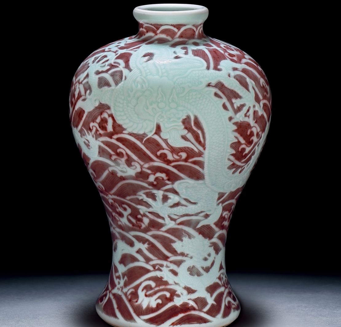 「不止青綠:歐美藏家藏中國色彩藝術珍品」,高估價拍品清雍正《釉裡紅剔刻海水龍紋梅瓶》估價2,600萬至3,500萬港元,由中國古董珍玩部高級專家胡犇手中電話委託買家,以2,500萬港元落槌,成交價3,000萬港元,穩居本季十週年拍賣會古美術板塊第一高價寶座。此瓶為博物館級拍品,通體以釉里紅為飾繪海水,留白暗刻海濤中騰躍大、小二龍,寓意「蒼龍教子」,雕刻與燒製配合得宜,展現出雍正上品御瓷的非凡麗質。清乾隆《釉裡紅九龍圖抱月瓶》估價1,500萬至2,000萬港元,則以1,500萬港元落槌,成交價1,800萬港元奪得亞軍。溢價最多的為宋《銀鏨刻雲雀紋梅瓶連蓋》逾低估價6倍多之32萬4,000港元。本品極其秀美,瓶身鏨刻雲雀紋,帶有原蓋者極罕見,梅瓶底足鏨刻有使用者的府宅字號,保存至今品相仍非常完美,珍罕少見。