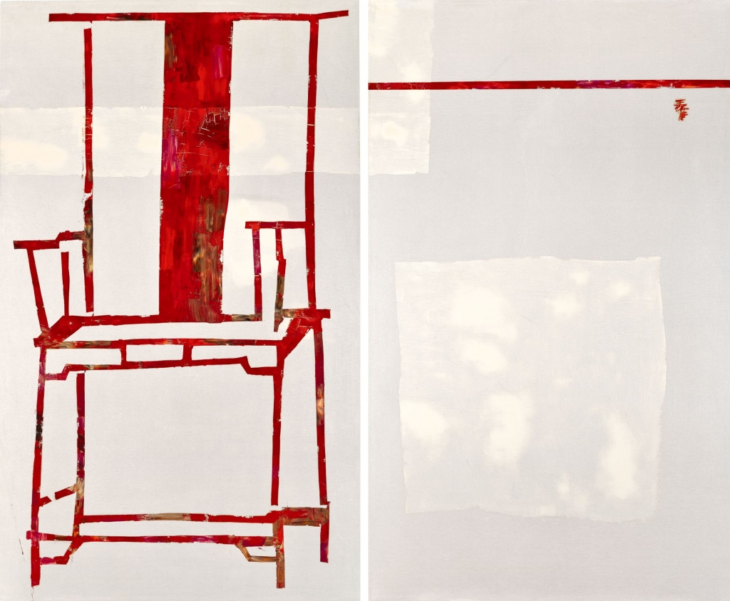 王懷慶的《一根紅線》匯融藝術家畢生美學核心與成就,形式大膽而懾人,曾作為王懷慶在西雅圖藝術博物館、日本兵庫縣立美術館兩大回顧展中的重要代表作亮相,現今首呈拍場,珍絕難得!作品跳脫藝術家早年對歷史、文化傷逝的感懷,展現步入臻境的新局。一反過去多以深黝黑彩描繪家具,此作以瀲灩的紅彩與白為主色,左聯刮刀與畫筆並用,以精煉、遒勁的線與塊體,描繪了一張明式官帽椅,椅背中正,造型朗健,透露堂皇、偉岸的氣息,椅子在此成為「人」的指代,可想見居上位者如一家之主、一國之主磊落光明的自信與大器風範。爽利的線條透出堅韌的生命力道,而椅背上刻意塑造的裂紋與在隱晦中碰撞的紅綠對比色彩,若言說時光荏苒在主角身上所增添的智慧。