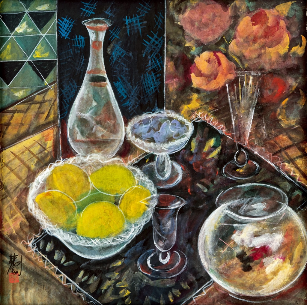 完成於1959年的《金魚與靜物》,大膽地以方中帶圓的多層次結構創造出有序而充滿張力平衡的幾何空間。前景飽滿的水果、晶瑩的玻璃器皿、金魚缸則與之相對,呈現生活的豐盛及美好。兼具濃淡輕重、以紅、白、墨、橙多色塊寫意繪就的金魚,靈動有神,如訴東方「知魚之樂」的意趣 。而背景菱格紋的窗欞、墨底藍彩的屏風,則展現如馬蒂斯帶裝飾主義的藝術風尚。作品由現亞洲重要私人藏家收藏逾二十年,並曾被收錄於《香港佳士得二十週年:二十世紀、當代藝精選》畫冊中,來源有序,此次釋出,可謂購藏良機。