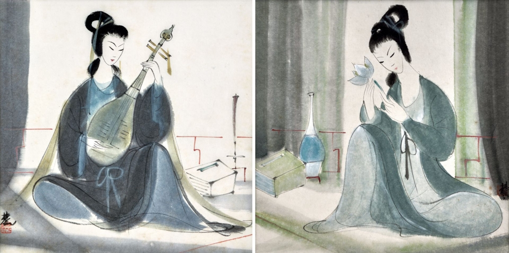 《閒情》囊括林氏仕女畫代表語彙,主角鳳眼挑眉,相對而坐,頷首提眉兩相呼應。左聯黛袍女子手持琵琶,撫琴奏樂,眉如秋水,肌伴輕風;右聯青衫仕女攜一株蓮花,細嗅芬芳。在毛筆、宣紙和典雅的色澤襯托下,透出如夢的詩情,既有東方古典仕女的風韻,線條又可比西方馬蒂斯的輕鬆優雅,展現林氏融古今中西為一的「中和之美」。二人專心致志,如若入無人之境,與心愛之物為伴,自得其樂。正如一心鑽研於藝術的林風眠一生寫照——無懼門前冷落車馬稀,但求一方天地自得其間!